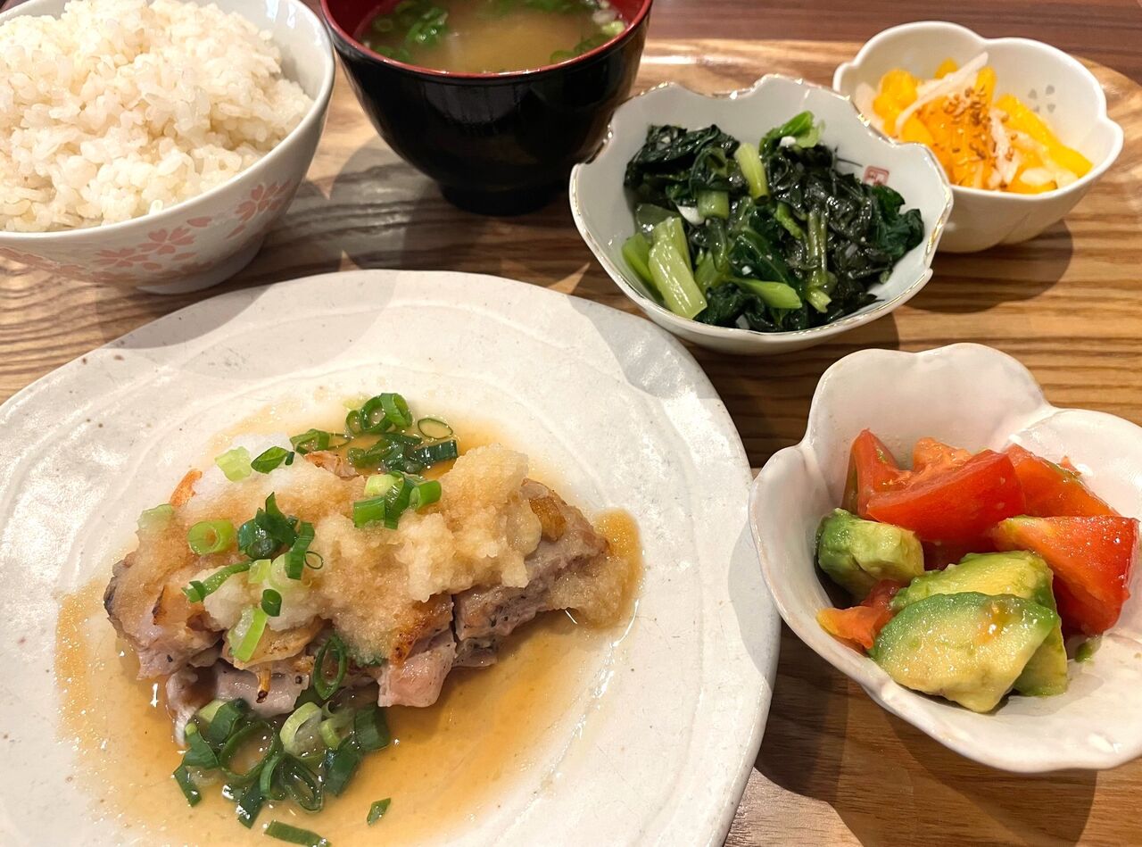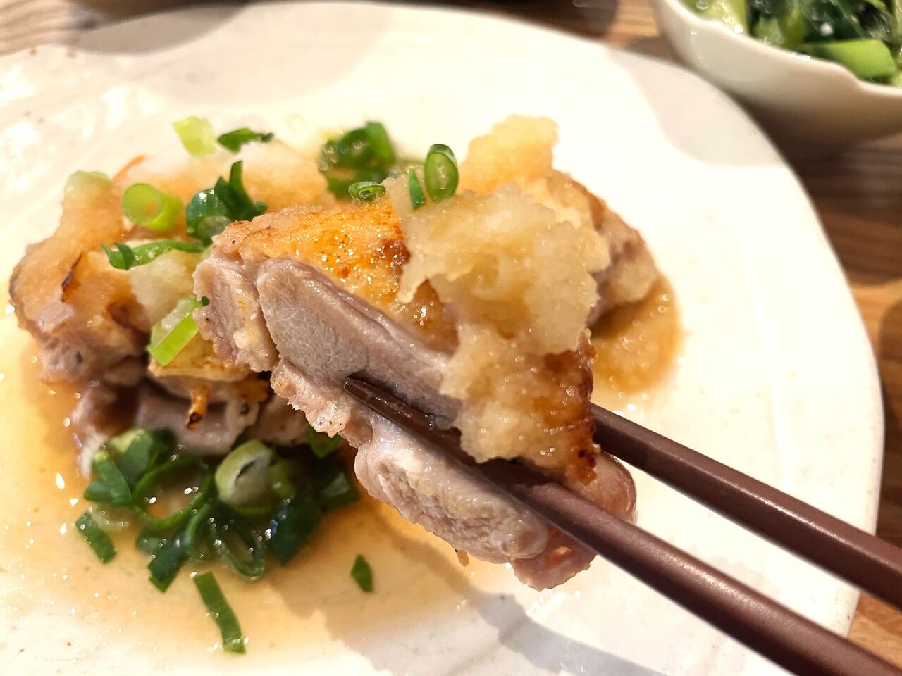 そしてメインはガーリック風味でぷりっとした肉厚食感のチキンを、たっぷりの大根おろし&ポン酢のナイスコンビであっさりいただきます。ヘルシーで美味しいだなんて最強ですね!