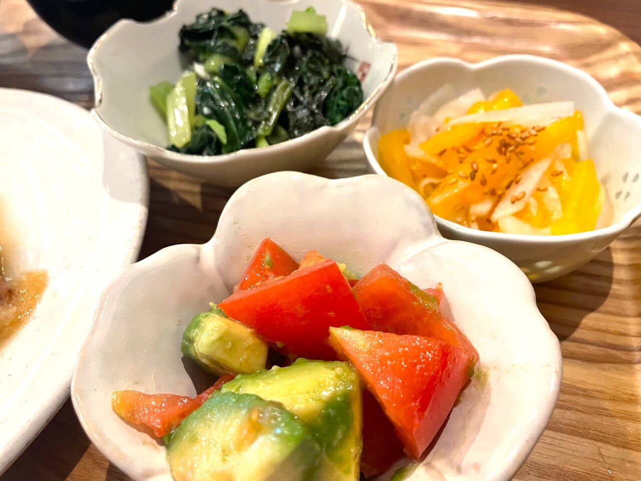 副菜のメニューは手前から、“トマトとアボカドのサラダ”、“大根と柿のなます”、 “小松菜のにんにくいため”…彩りも鮮やかでいいですよね。どれも素材そのものの味を活かしつつ、どこかホッとするやさしい味付け。