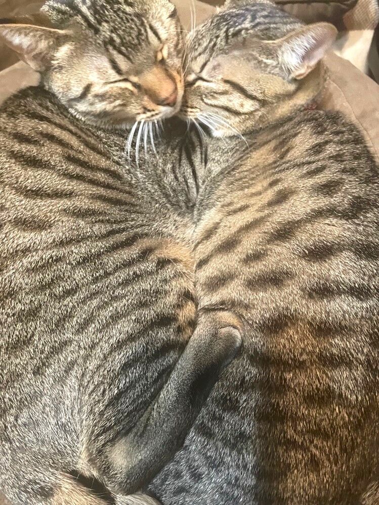 ある日、お家のポストに入っていた「猫の譲渡会」のチラシを見て、見学程度に息子さん2人と出かけた、さお様。キジトラ兄妹を見て悩んでいたところ、息子さん2人が乗り気で背中を押し、2匹をお家に迎えられたそうです。「遊んだり、話したり、眠ったり、いつも一緒の仲良し兄妹、2歳になりました~