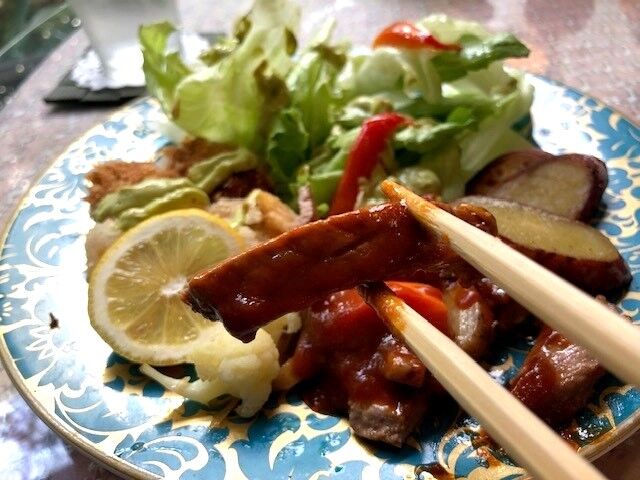 メインのお皿には、ボークソテー、エビの天ぷら、牡蠣フライ、サツマイモのレモン煮、サラダなど盛りだくさん。サラダのドレッシングも美味しかったです。