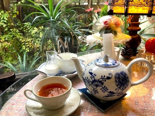 紅茶はティーポットで。茶葉も選ぶことができ、イングリッシュブレックファーストを選びました。ダージリンやアールグレイなどもあります。ロッジを始めて46年のオーナーさんは「以前はバタバタと忙しくしていましたが、今はお客さんとゆっくり話すのが楽しみなんです」とおっしゃっていました。