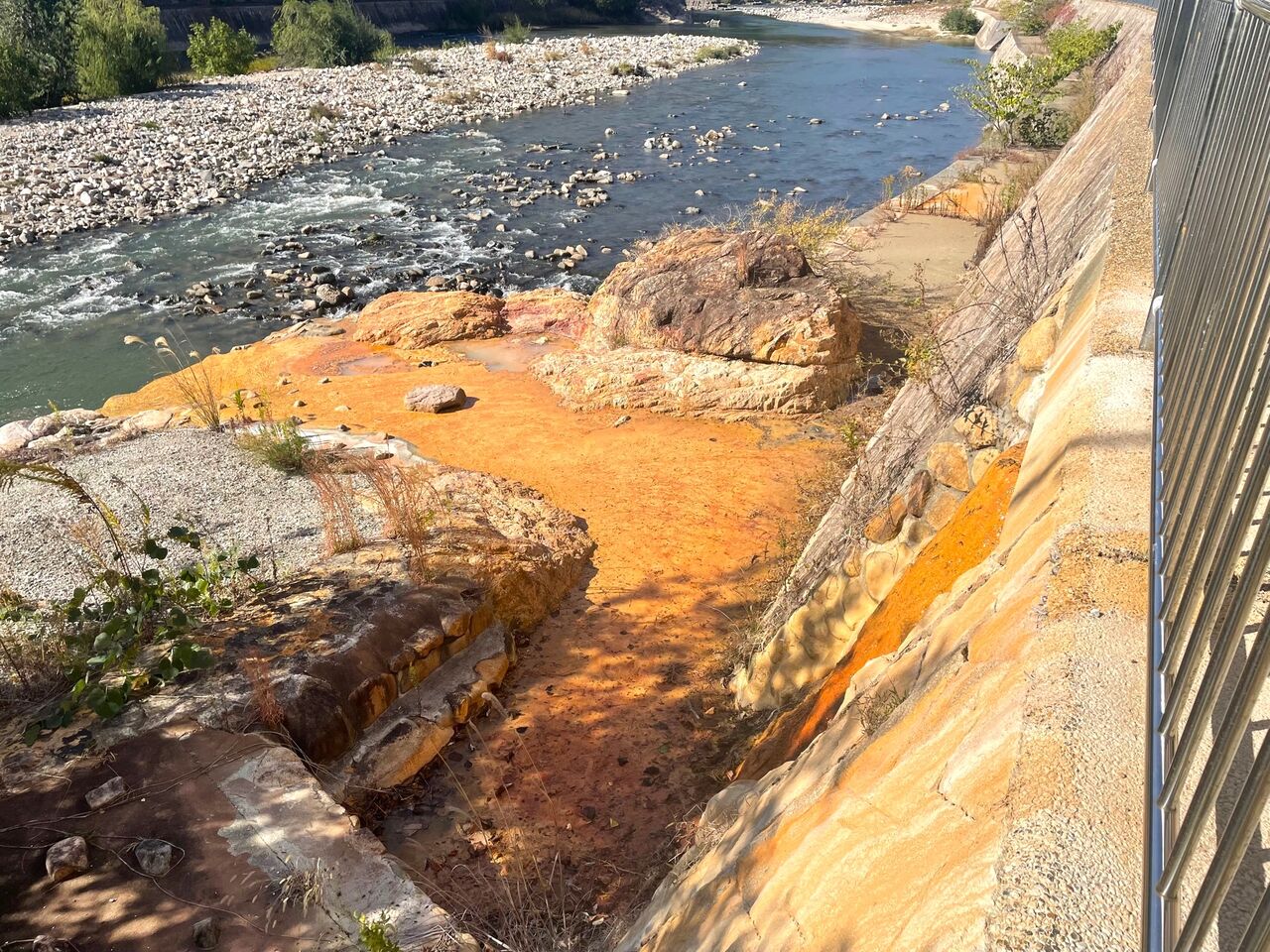 吹き出す温泉が鉄分を多く含んでいるそうで、武庫川へ流れる道筋がオレンジ色のように広がって見えます。旅館の跡地がマンションになり、その一部に源泉が残されているようですね。