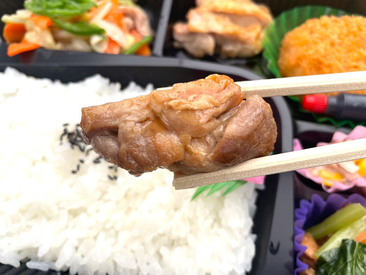 てりやきチキンはぷりっとした弾力のある食感に、甘辛い照り焼きの味つけがちょうどいい塩梅でご飯のすすむお味です。