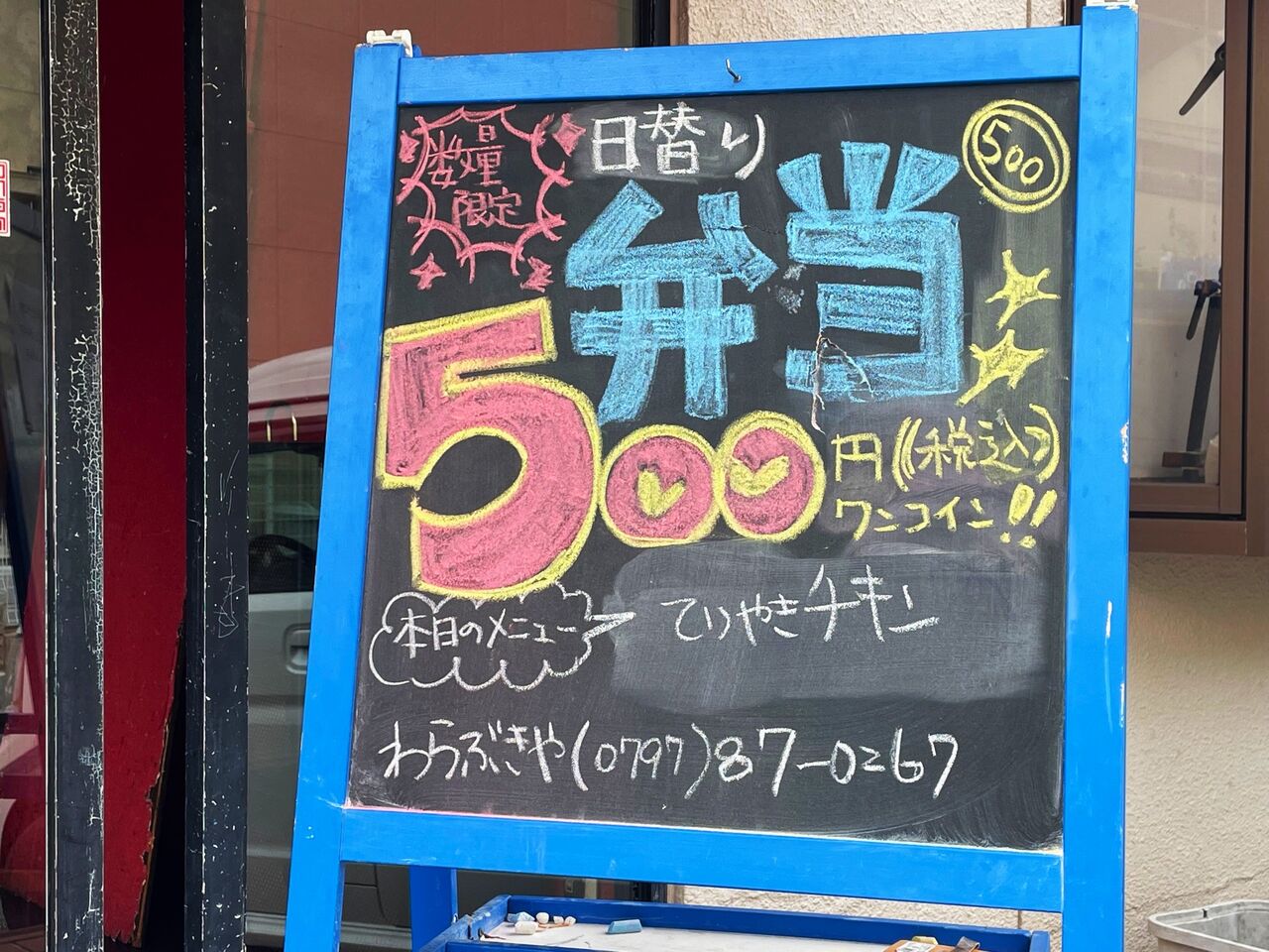 店頭にブラックボードが出ています。 数量限定の日替り弁当なんですね。この日のメインメニューは「てりやきチキン」! スタッフ大好物です♪