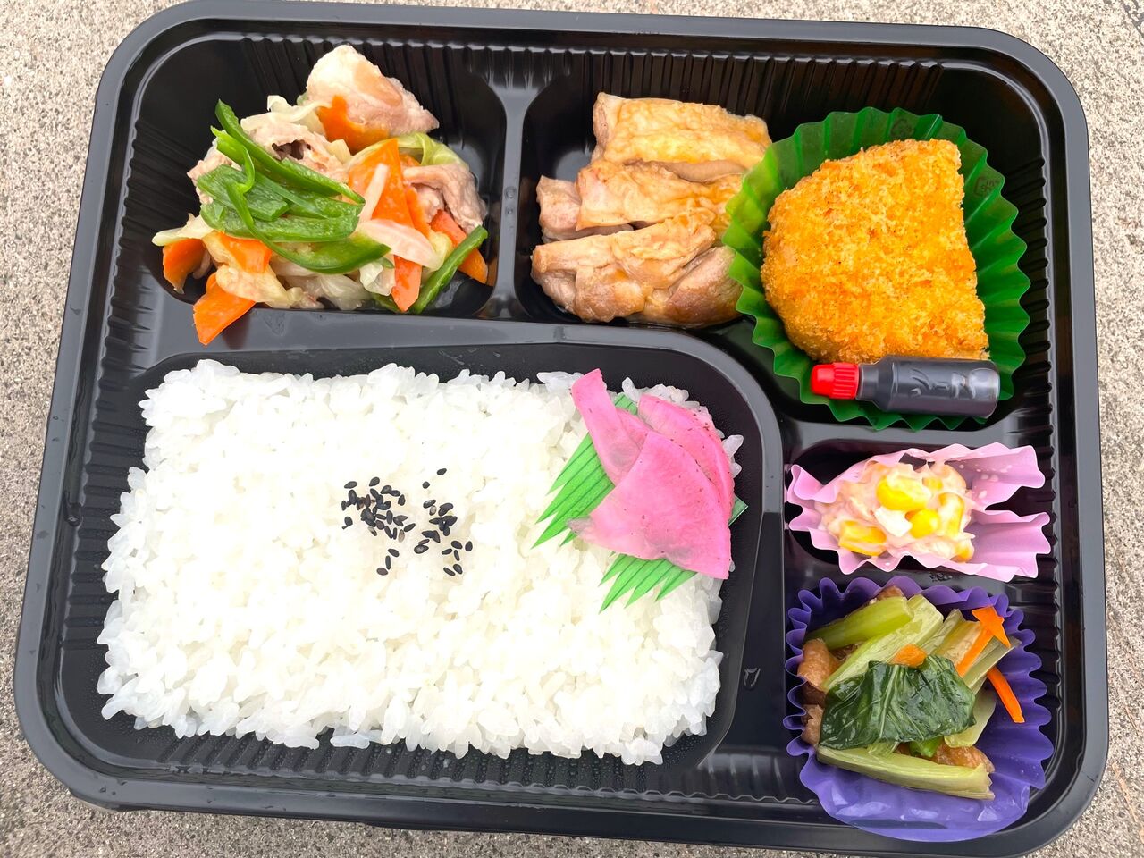 こちらもカラフル&品数多し!ホタテフライや春雨サラダなど、食感や味付けもいろいろ違っていて、手の込んだお弁当。美味しくいただきました。もちろん、500円ですよ!