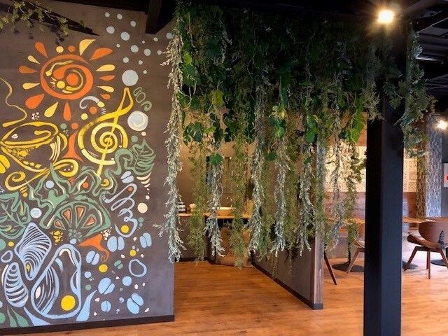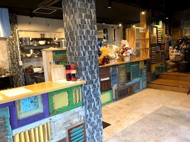 お店に入るとフォトスポットになりそうな印象的なイラストが。絵は手描き、お店に使用されている建材はバリから輸入したもので、3Fはデザイン事務所になっています。