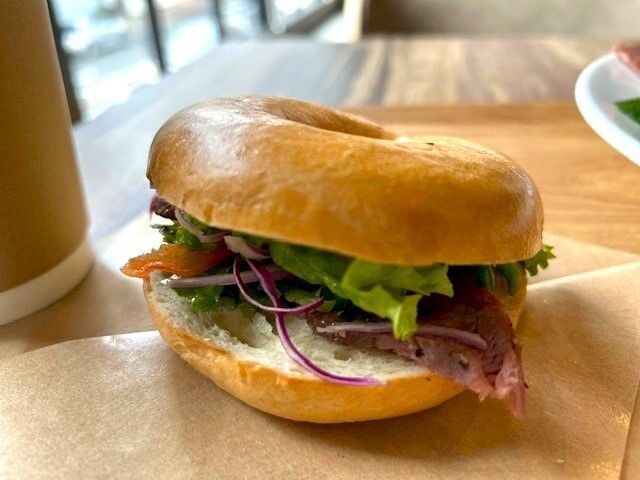 ベーグルを持ったら、温かい‼ よく見ると半分にカットしてありました。なるほど、トングがあるから何故?と思っていたんです。サンドして食べられるってことですね。