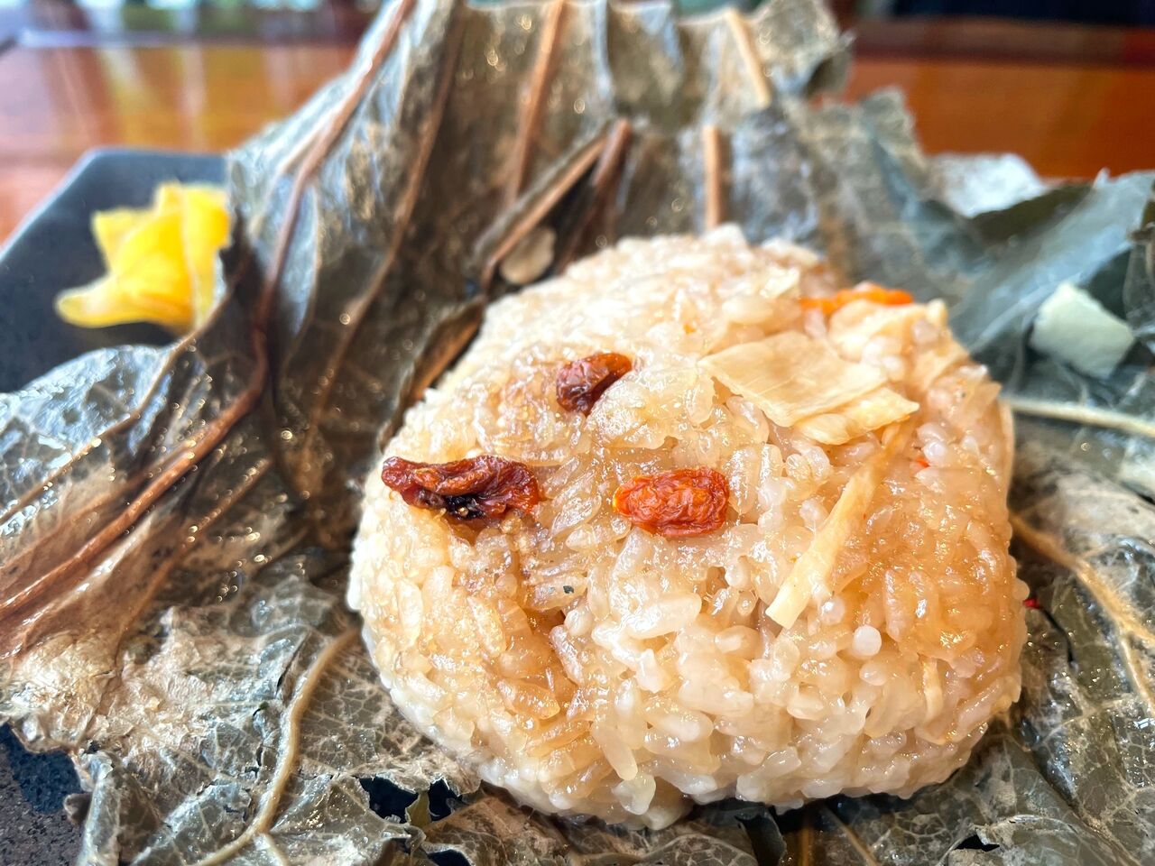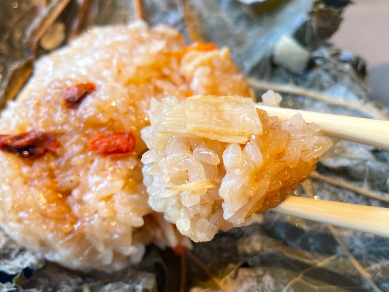 お店の方によれば、“蓮筍ごはん”とは、筍ごはんを蓮の葉で包んだものなのだとか。筍ごはんが熱々のうちに包むので、蓮の上品な香りも楽しめる美味しい逸品になるのだそう。