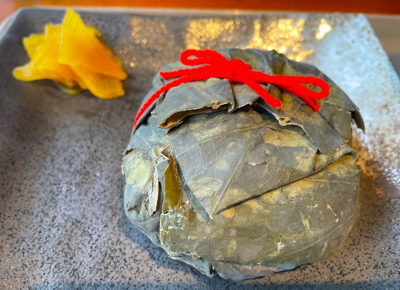店の入口にもサンプルがありました…が、葉っぱに何かが包まれて紐で結われている状態。ちょっと謎めいたビジュアルですよね~。