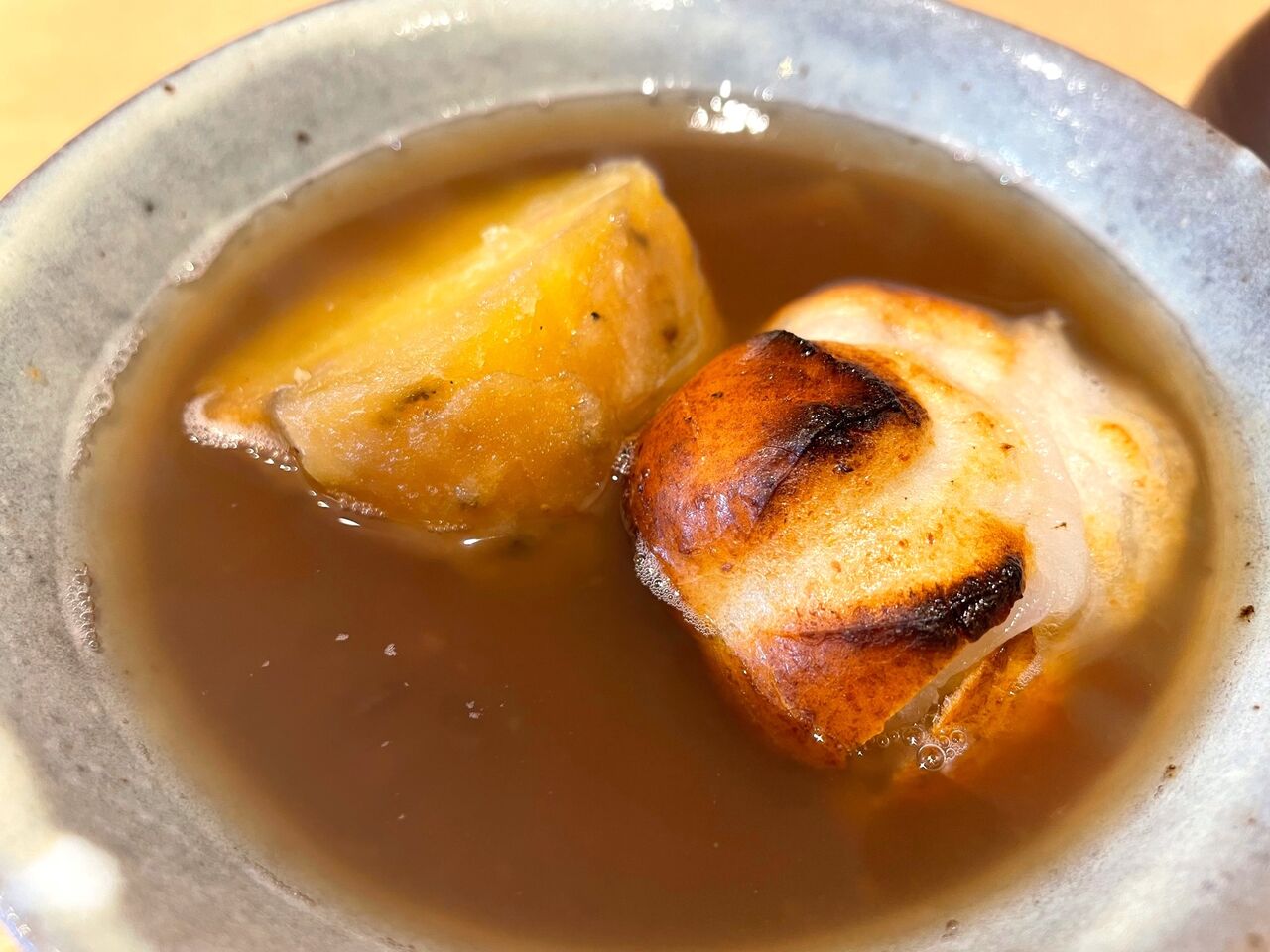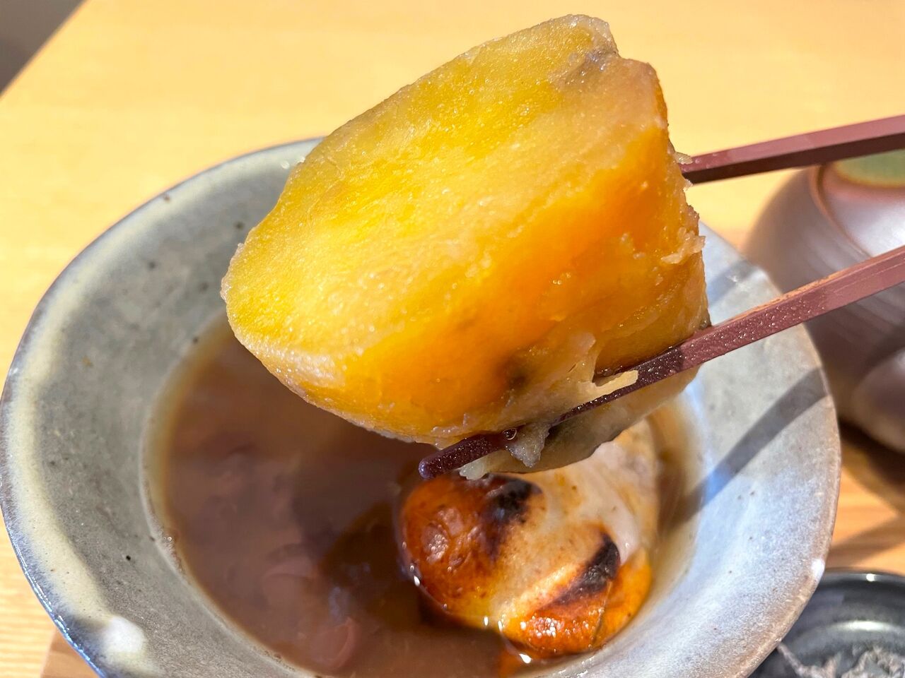 登場したお椀の中には焼き立ての香ばしい匂いを漂わせている美味しそうな焼きもちと、黄金色の焼き芋が確かに入っています。