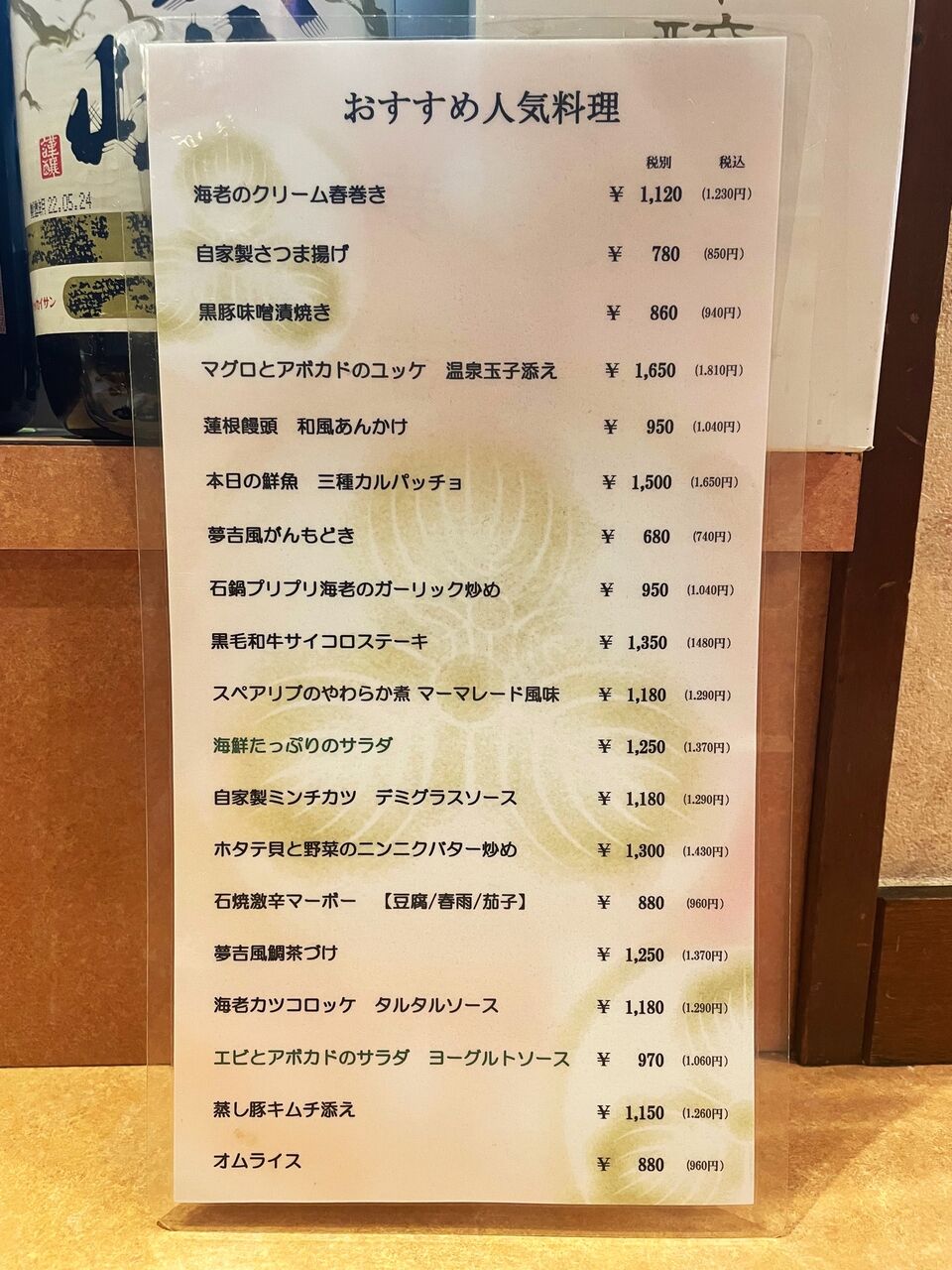 少し気になったので、夜のメニューも見せていただいたのですが、「おすすめ人気料理」を見ただけでも、どれも美味しそう!