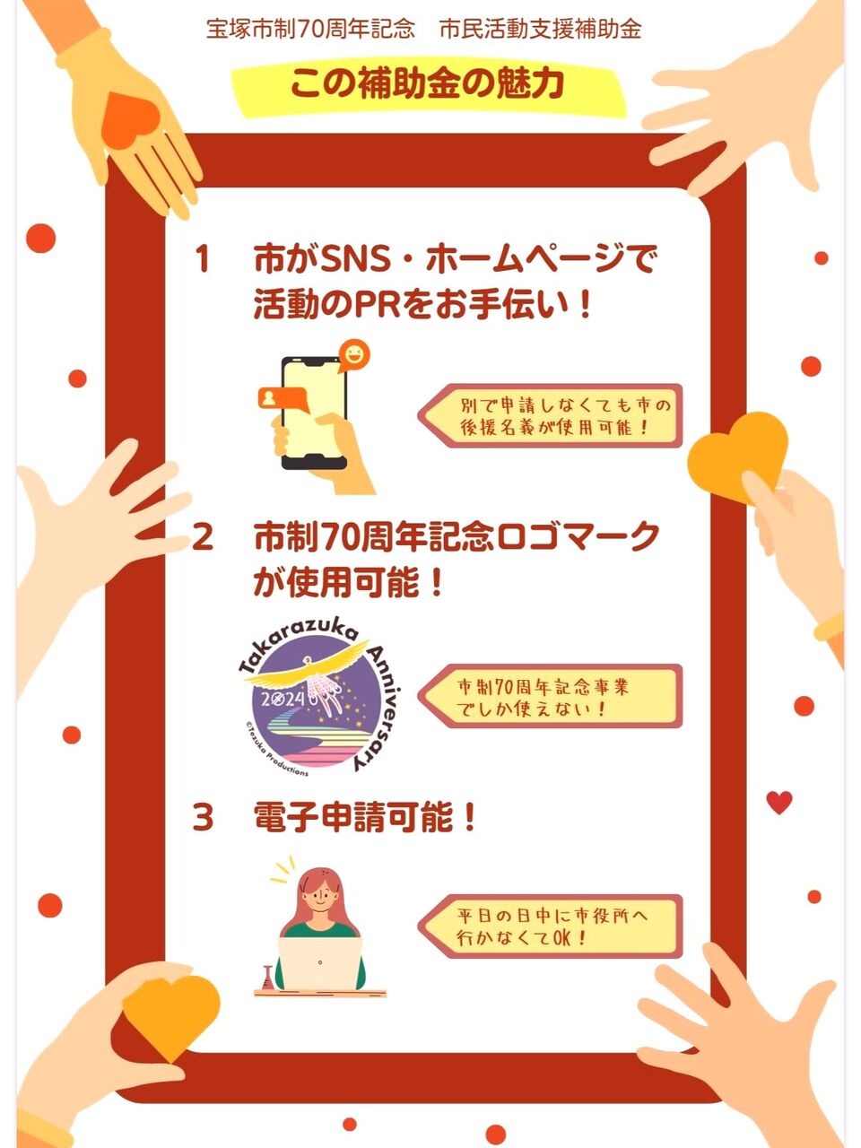 申請手続きなど、わからないところは宝塚市役所・市民協働推進課までお問い合わせください。「補助金の申請なんてできるかな?初めてだから自信がないなぁ」と思っている方は、気軽に聞いてみるのもいいのではないでしょうか。募集は始まっています