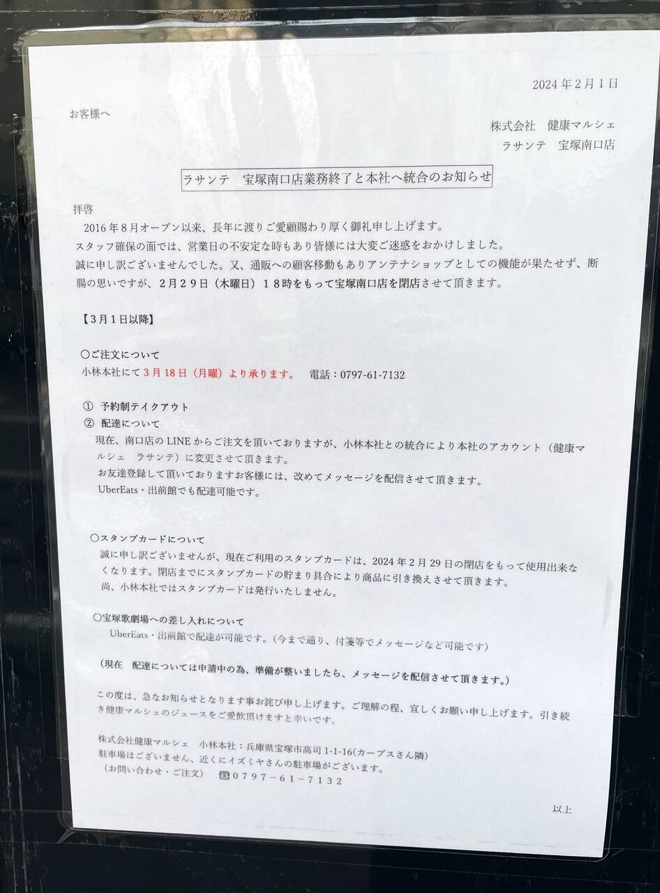 貼り紙によれば、南口の店舗は閉店となりますが、今後は小林本社となる「健康マルシェ」にて、予約制テイクアウトで販売を続けられるそう。