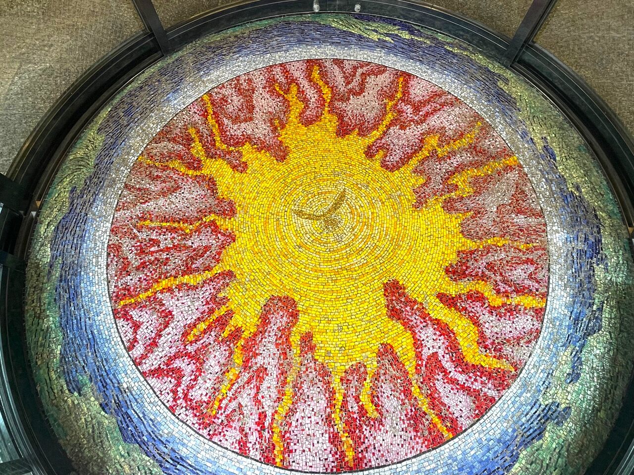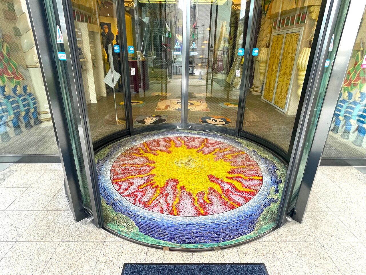 そう、これは記念館の入口。ガラス製の自動ドアが開いたところで足元を見ると、そこはモザイクタイルのアート床になっています。