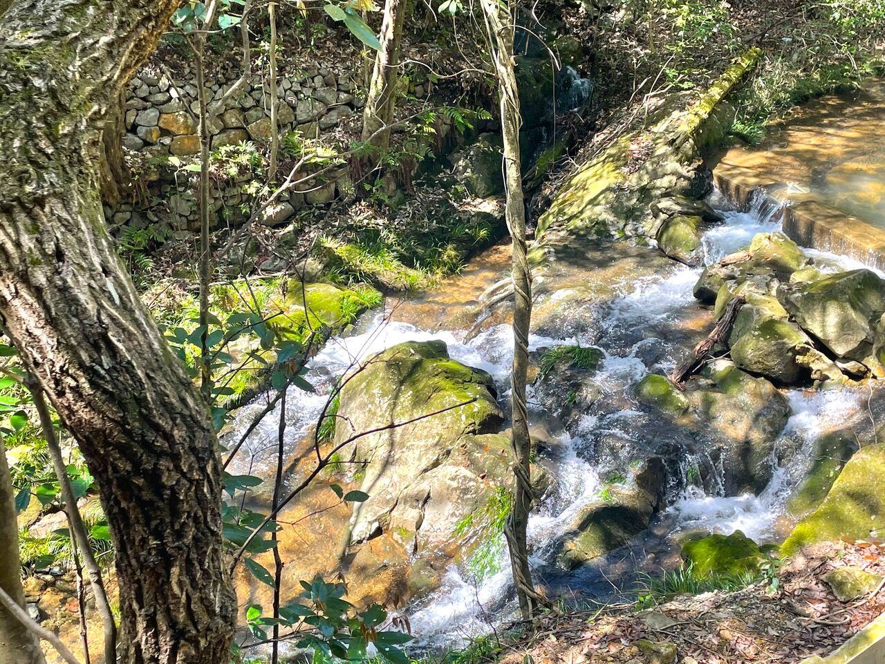 山道の横には川が流れています。最明寺滝から流れてくる川なのでしょうね。川のせせらぎの音は本当に癒されます。時折、鳥たちのさえずりも聞こえたりして、心地よく木漏れ日の中をてくてく…。