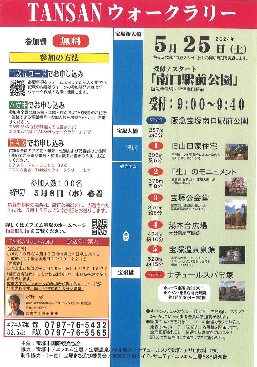 ウィルキンソン タンサン発祥の宝塚で、タンサンと温泉にまつわる5つのスポットを通過し、ゴール会場で、ラジオ放送で発表されるキーワードを記入する用紙を貰い、応募すれば抽選で豪華賞品が当たるイベント、それがTANSANウォークラリーです。5か所の通過地点のスタンプを全て集めた参加者には全員記念品もあるそうです。