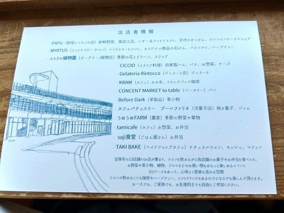 「宝塚市の13店舗のお店が集まり、ワインを飲みながら各店舗のお菓子やお弁当を食べたり、お野菜や革小物、植物、アロマなどのお買い物もゆるっと楽しめるイベント」と書いてあります