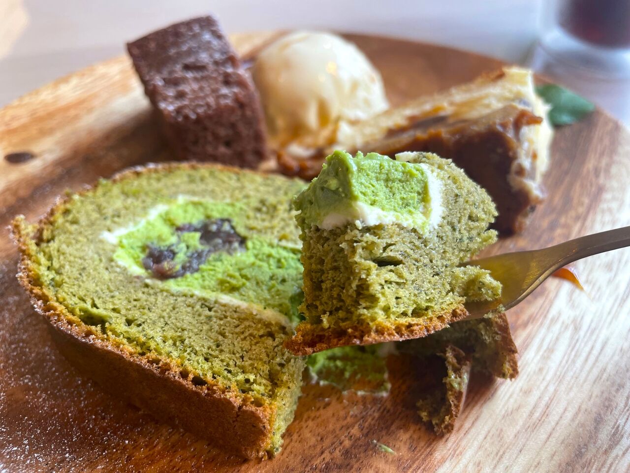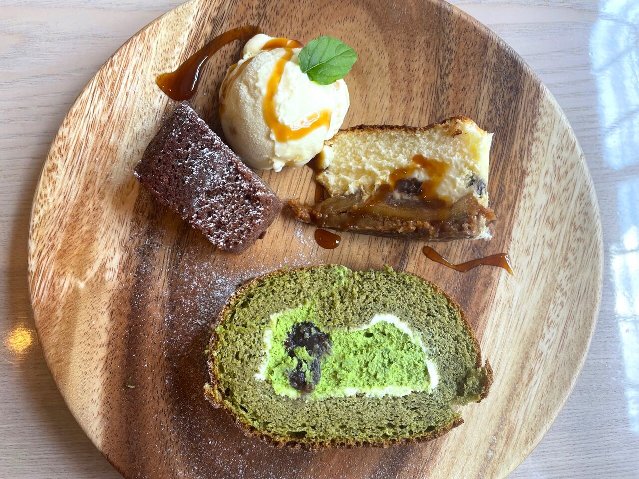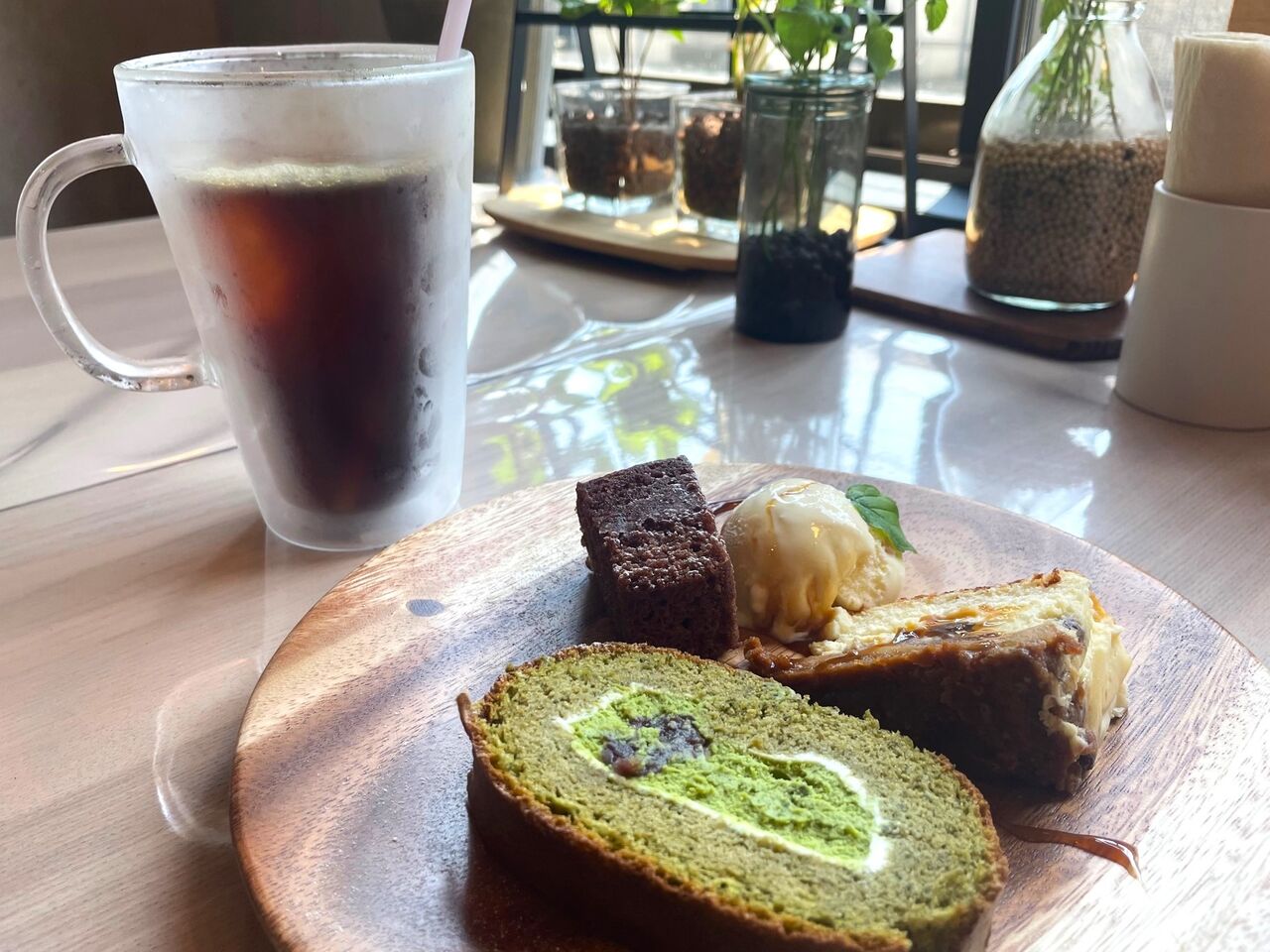 これで400円でいいんですか?!という豪華な盛合せ。本日のケーキの中から抹茶のロールケーキ、りんごのチーズケーキ、そして焼菓子からごまとチョコのブラウニー、さらにアイスクリームがワンプレートに。贅沢なうえに、コスパ最強ですね!