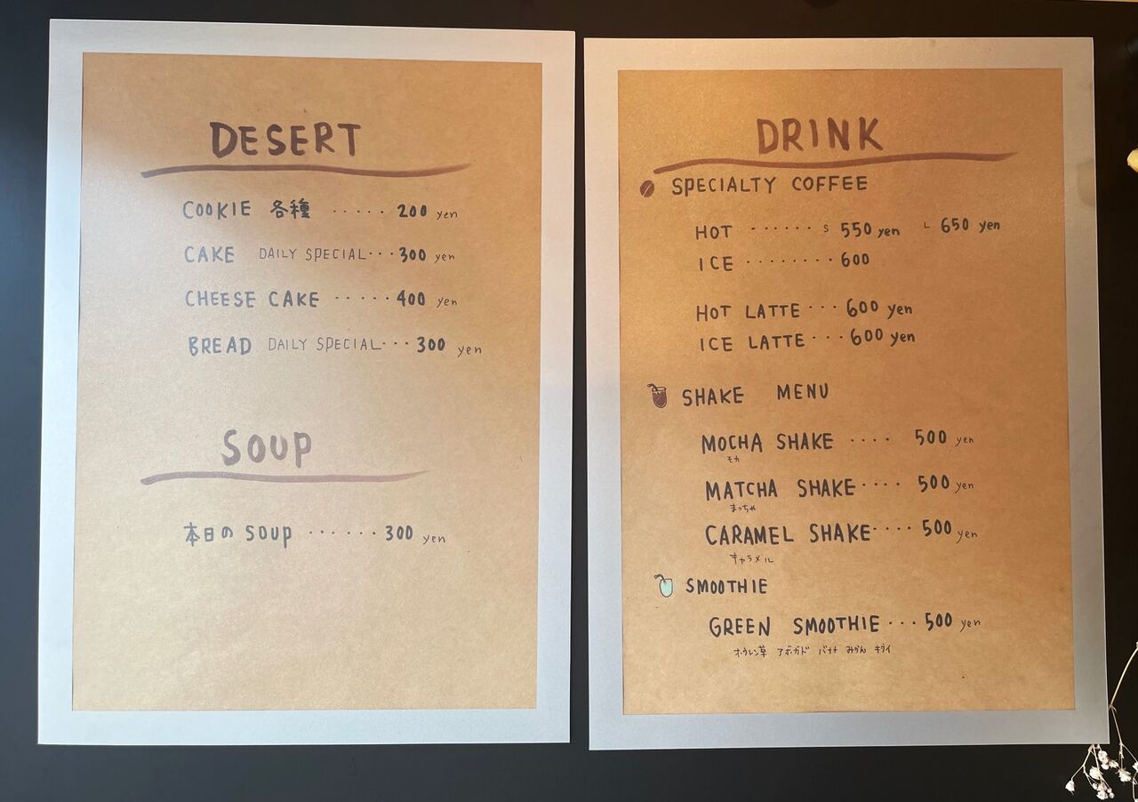 メニューはスイーツや、コーヒーをはじめとするドリンクの他に、小腹が空いた時にはスープなどもあります。それぞれにオーナーさんのこだわりがあり、スイーツはグルテンフリー、スープは野菜たっぷり、と体にやさしいラインナップです。