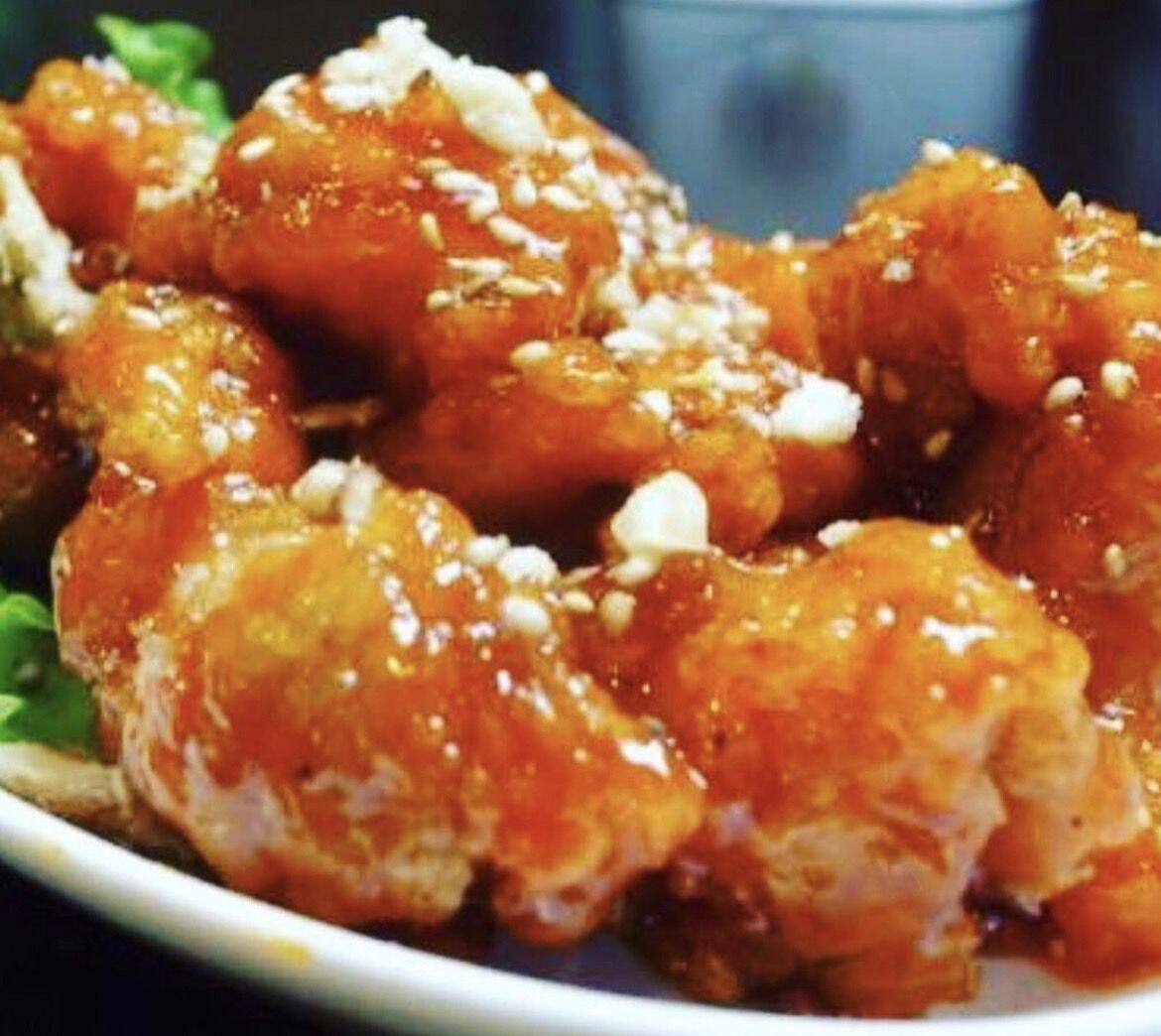 揚げたてのチキンにコチュジャン入りの甘辛ソースを絡めたものです。