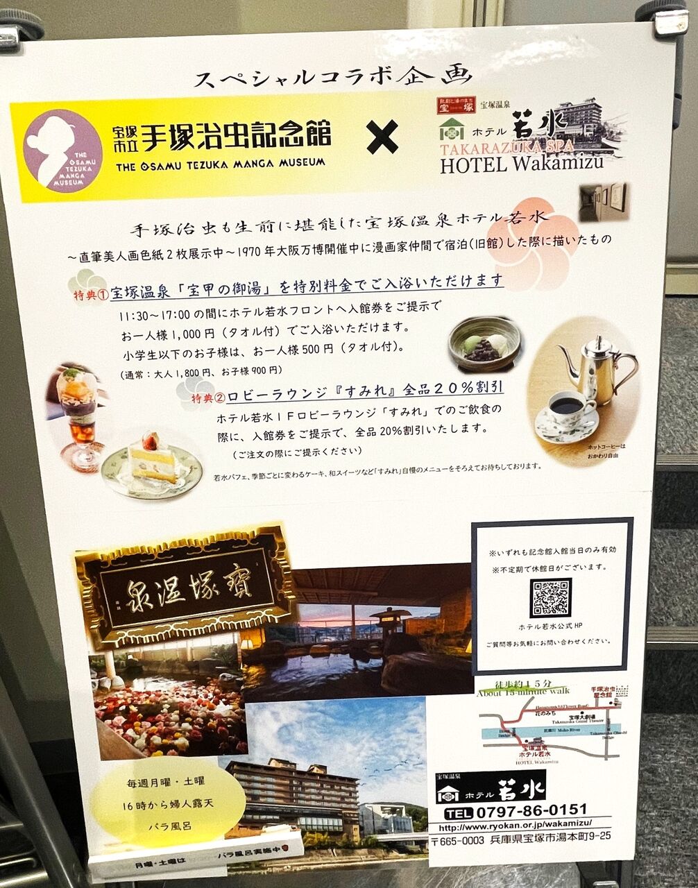 まずひとつめは『手塚治虫記念館』の入館券を『ホテル若水』フロントで11:30~17:00のあいだに提示すると、宝塚温泉「宝甲の御湯」に、特別料金で入浴できます!