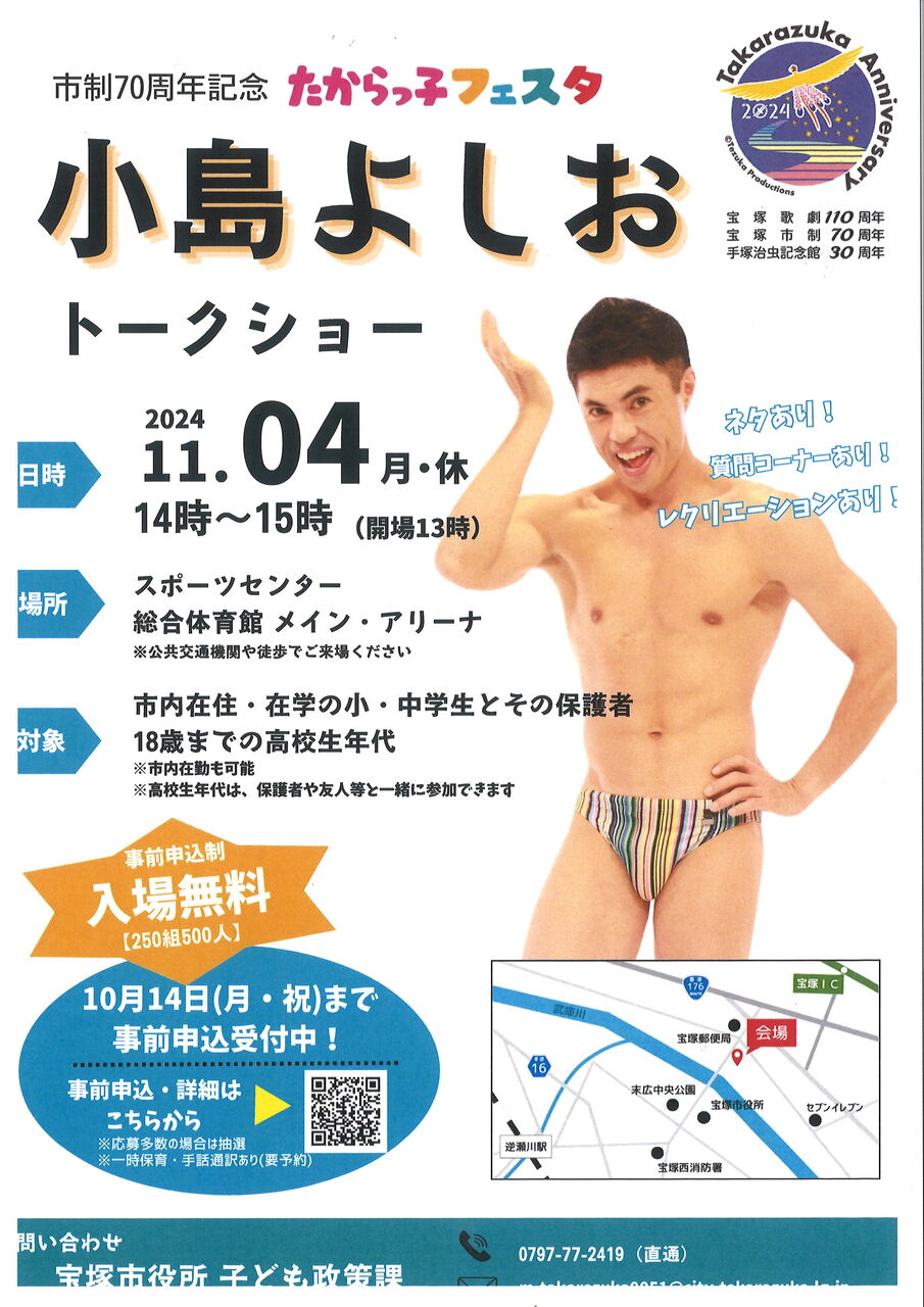 「はいっ おっぱーぴー!」で今やこどもに人気の小島よしおさんが、宝塚市にやってきて、ネタあり、質問コーナーあり、リクレーションありのトークショーを開催します。(入場無料)