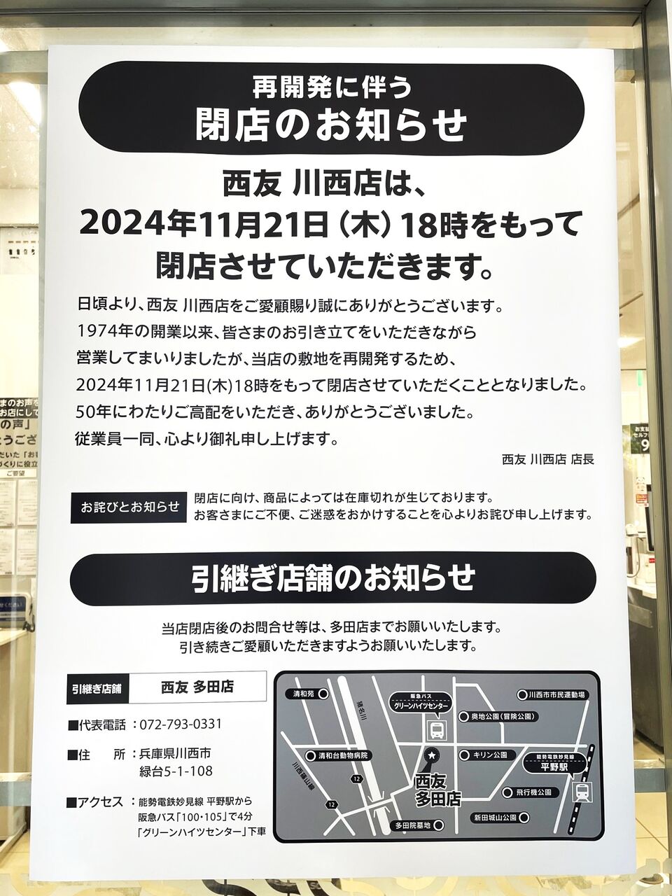 川西能勢口駅前の西友が11月に閉店!