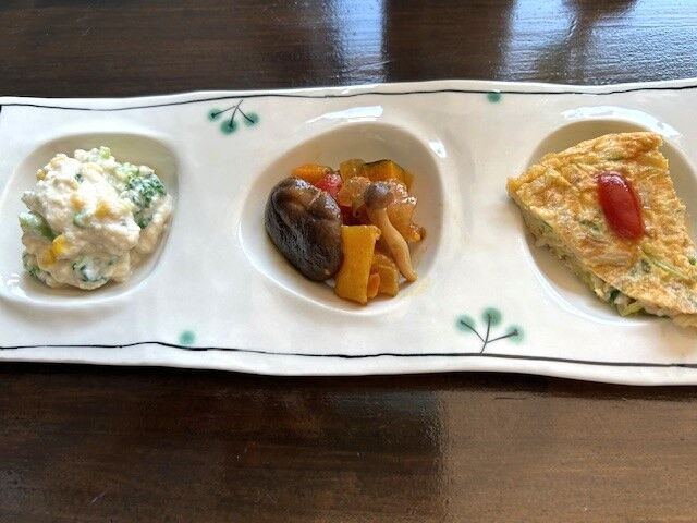 先ずは前菜3種、左からコーンとブロッコリーの白和え、和野菜のトマト煮、オムレツです。白和えは和のものだと思っていたのですが、コーンやブロッコリーにも合うんですね。目から鱗でした。和野菜の煮物だと思ったら、少しピリッとしてトマト風煮込みでした。オムレツも野菜入りでどれも美味しくいただきました。