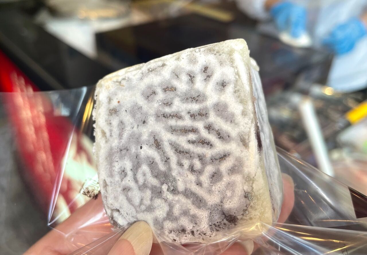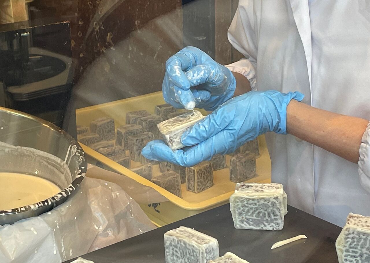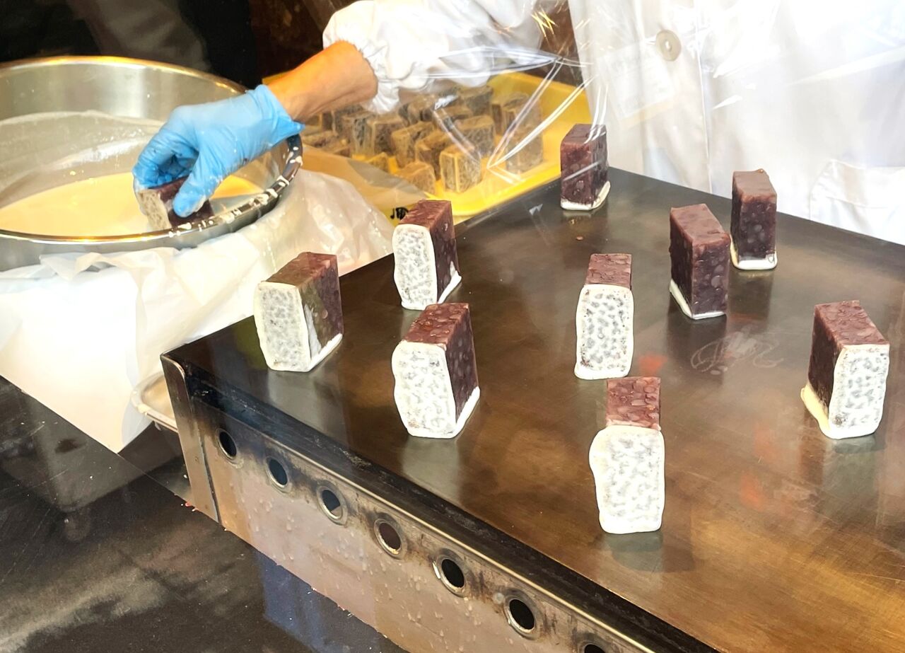 四角いかたちにカットされたあんを手に持つと、ボウルの中にある生地へ一面だけさっと浸して熱々の鉄板の上へひょいひょいっと並べていきます。まるでストーンヘンジかのように角切りあんこが鉄板の上に並んでいきますよ~なんだか可愛い!