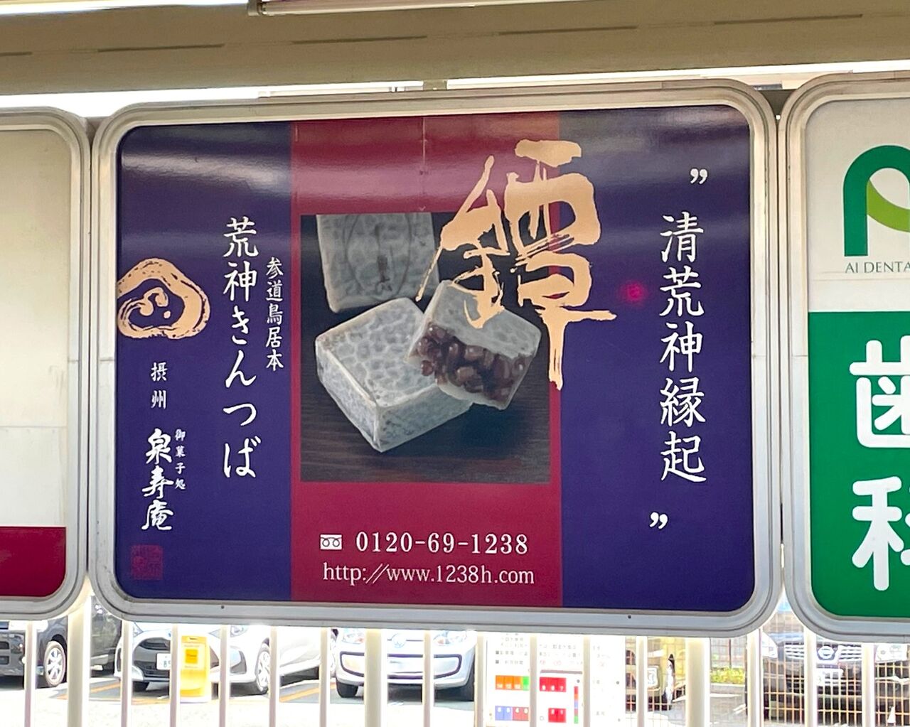 阪急清荒神駅のホームにも、こちらの美味しそうなきんつばの写真を使った看板があります。