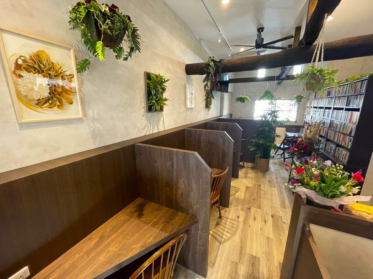 お店の中は、グリーンをたくさんあしらいウッドスタイルを活かした落ち着いた空間。高い天井に存在感を放つ梁がナチュラル感を際立たせていて、リラックスできそうな空間です。