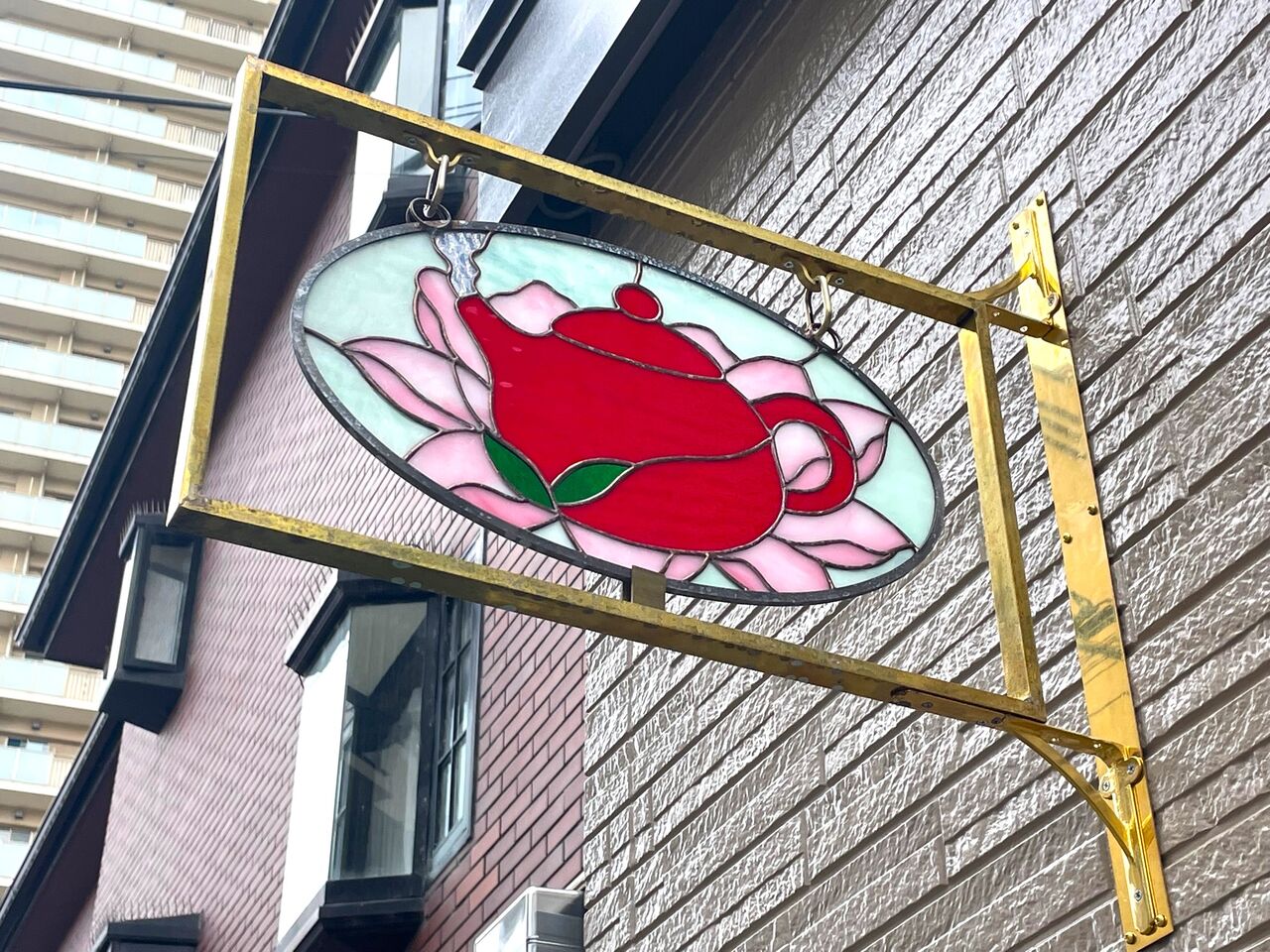 お店の入っている建物に掲げられているのは、蓮の花に急須が載ったステンドグラス。素敵なショップサインですね!