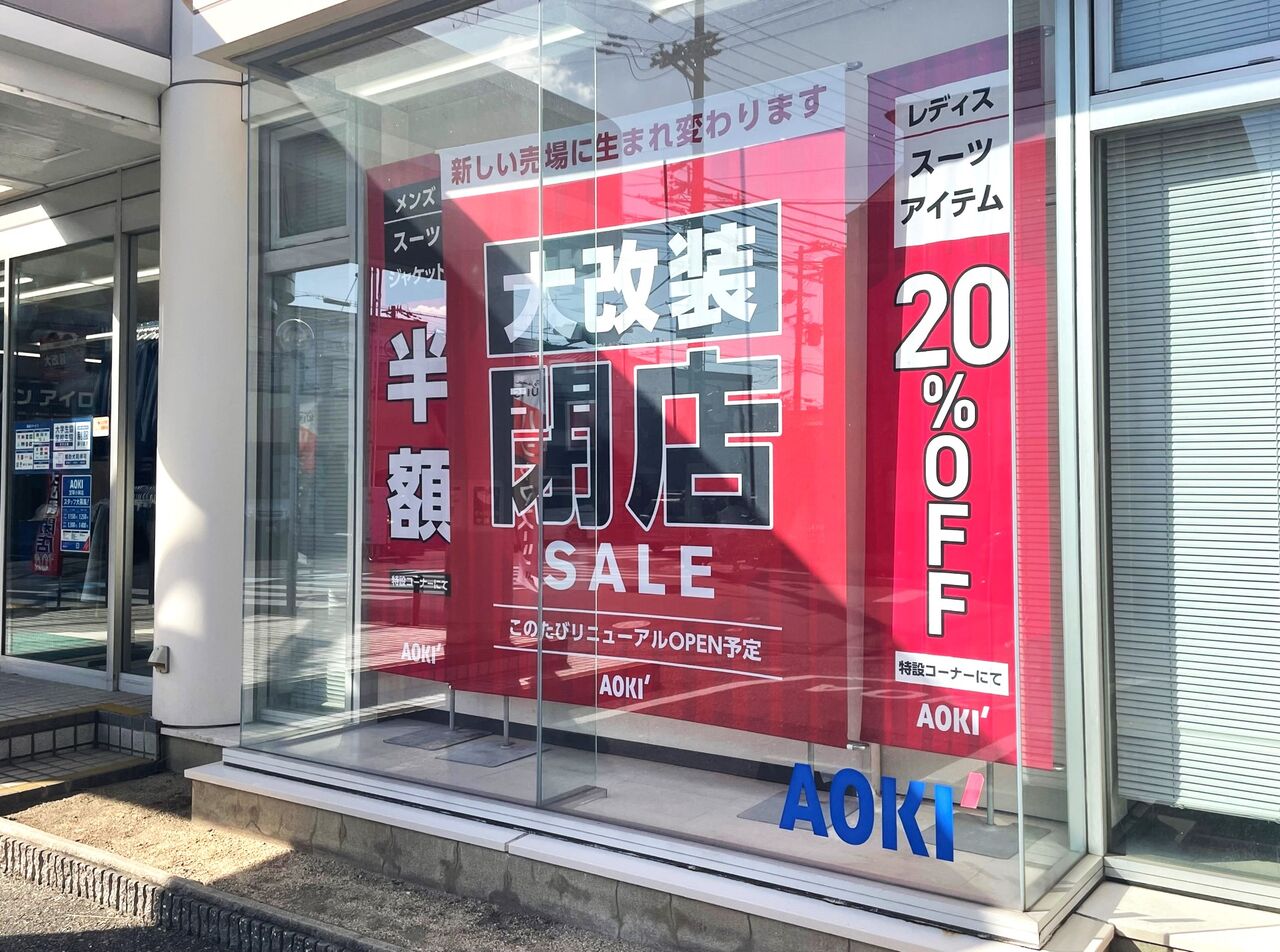 そこでさっそく現地へ行ってみると、「AOKI宝塚小林店」入口にバーン!と「大改装閉店SALE」とありました。ちなみにレディスのスーツアイテムは20%OFF、メンズスーツやジャケットはなんと半額だそうです!お得!