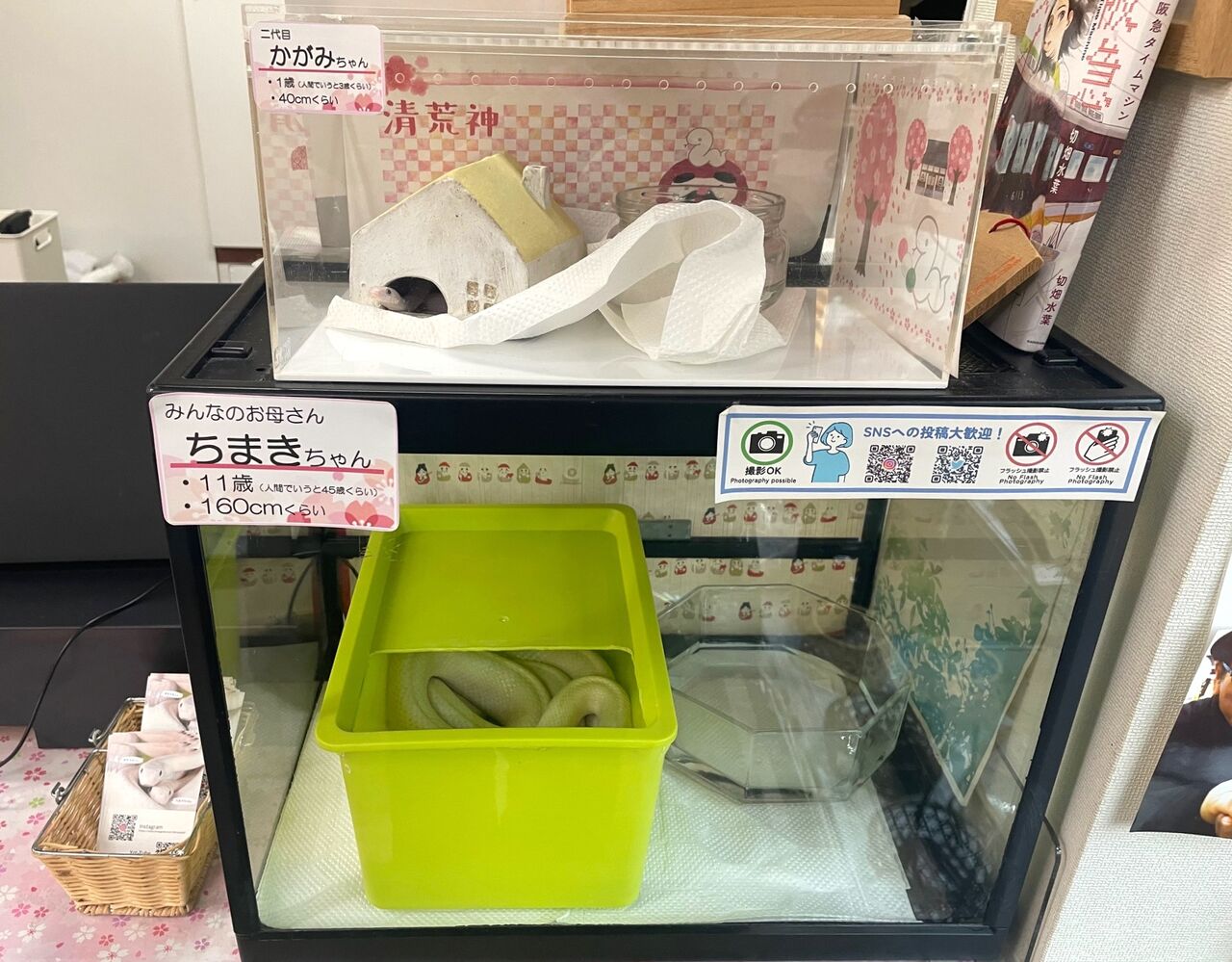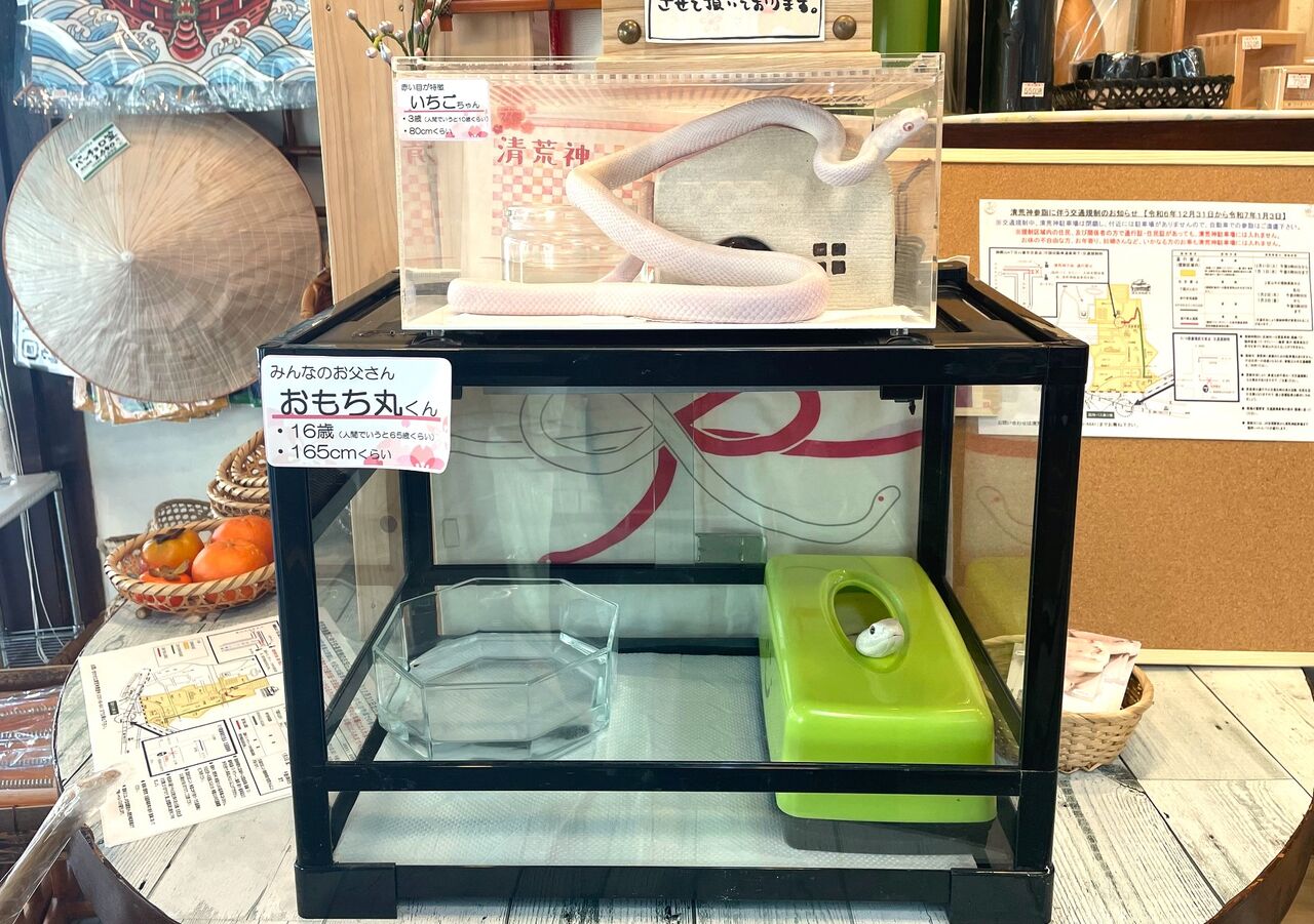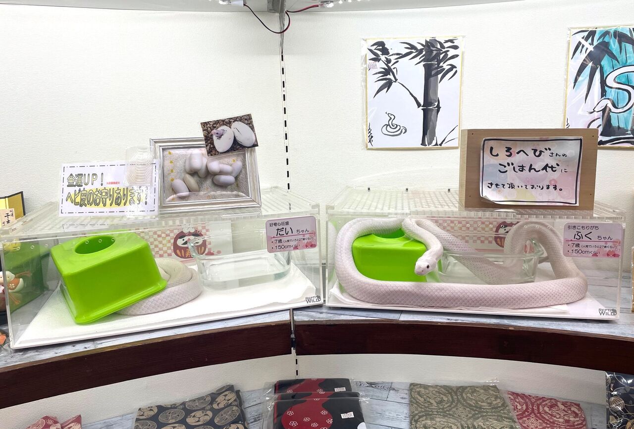 それがお店で飼われている白蛇たち! 看板犬ならぬ、看板蛇ですね。現在、お店には8匹の白蛇ファミリーがいますよ~。