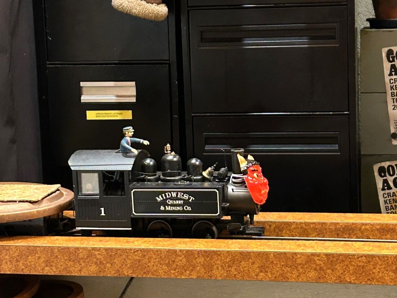 注文したグラタンが焼けるまで、暫し我慢。座った席の向こう側のレールにミニ機関車がスタンバイしています。取材日が節分近くだったので、鬼の面を被っていました。