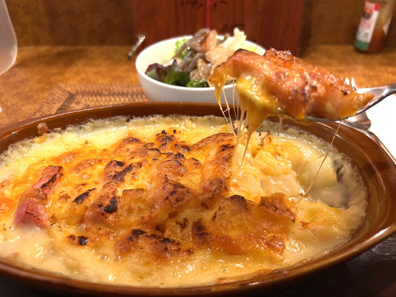 ホクホクのじゃがいもも、ホワイトソースによく絡んだマカロニも、味へんのように感じるドリアベースも、3種も楽しめるなんてとっても得した気分でした。ベーコンもたっぷり、チーズのカリカリの焦げ具合も美味しく、体の中からぽっかぽかに温まるグラタンは、寒い冬にぴったりです。