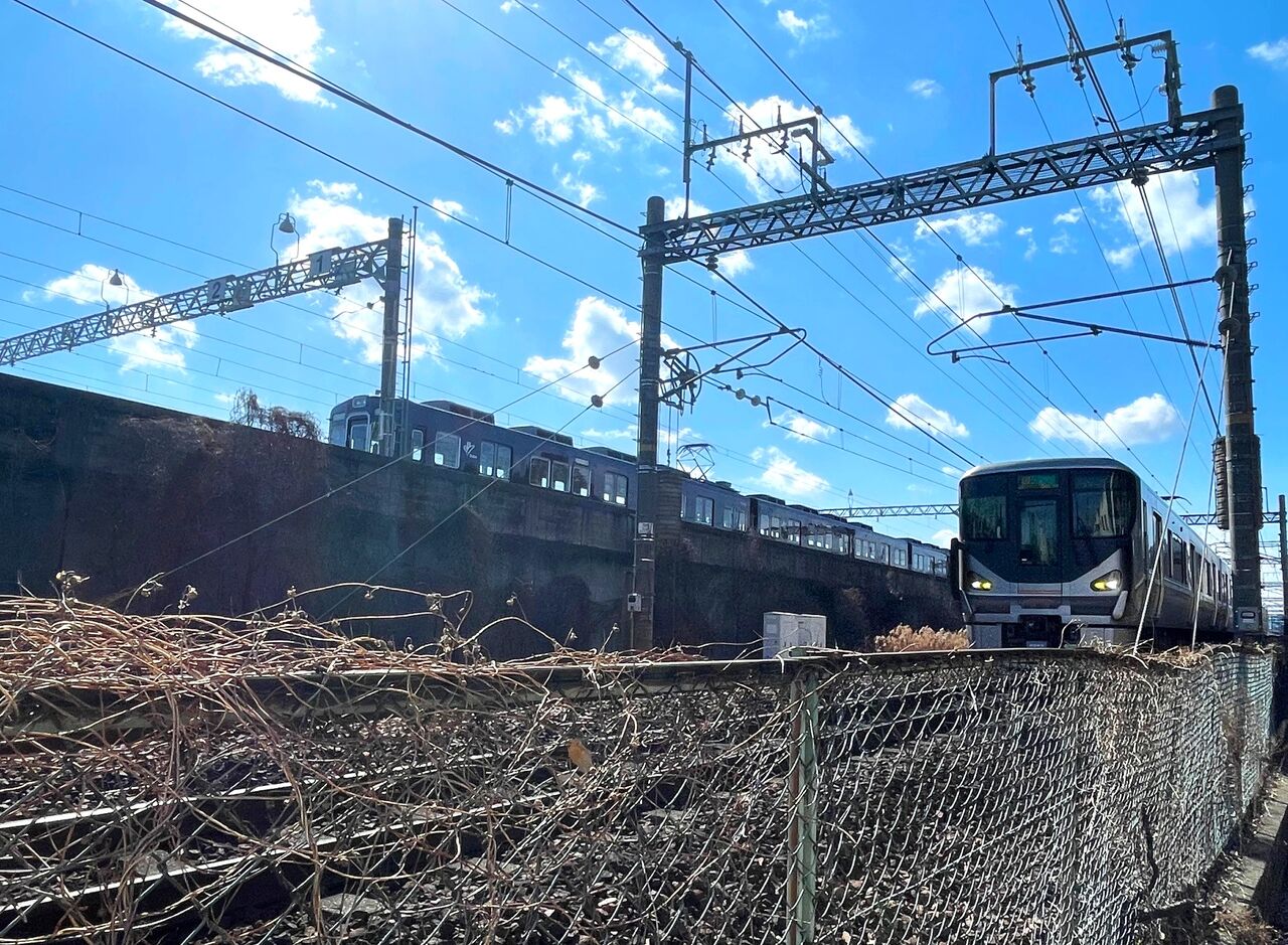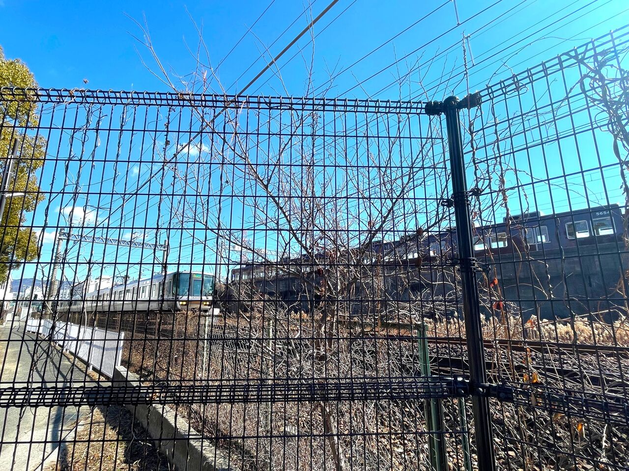 そこで公園を出て、道から柵越しに見てみました。 おお~~~~JRが目の前をビュンビュン走っていきます!近い~~ッ!しかし、近すぎるがゆえ、車庫に停車している阪急電車は隠れてしまいますね。