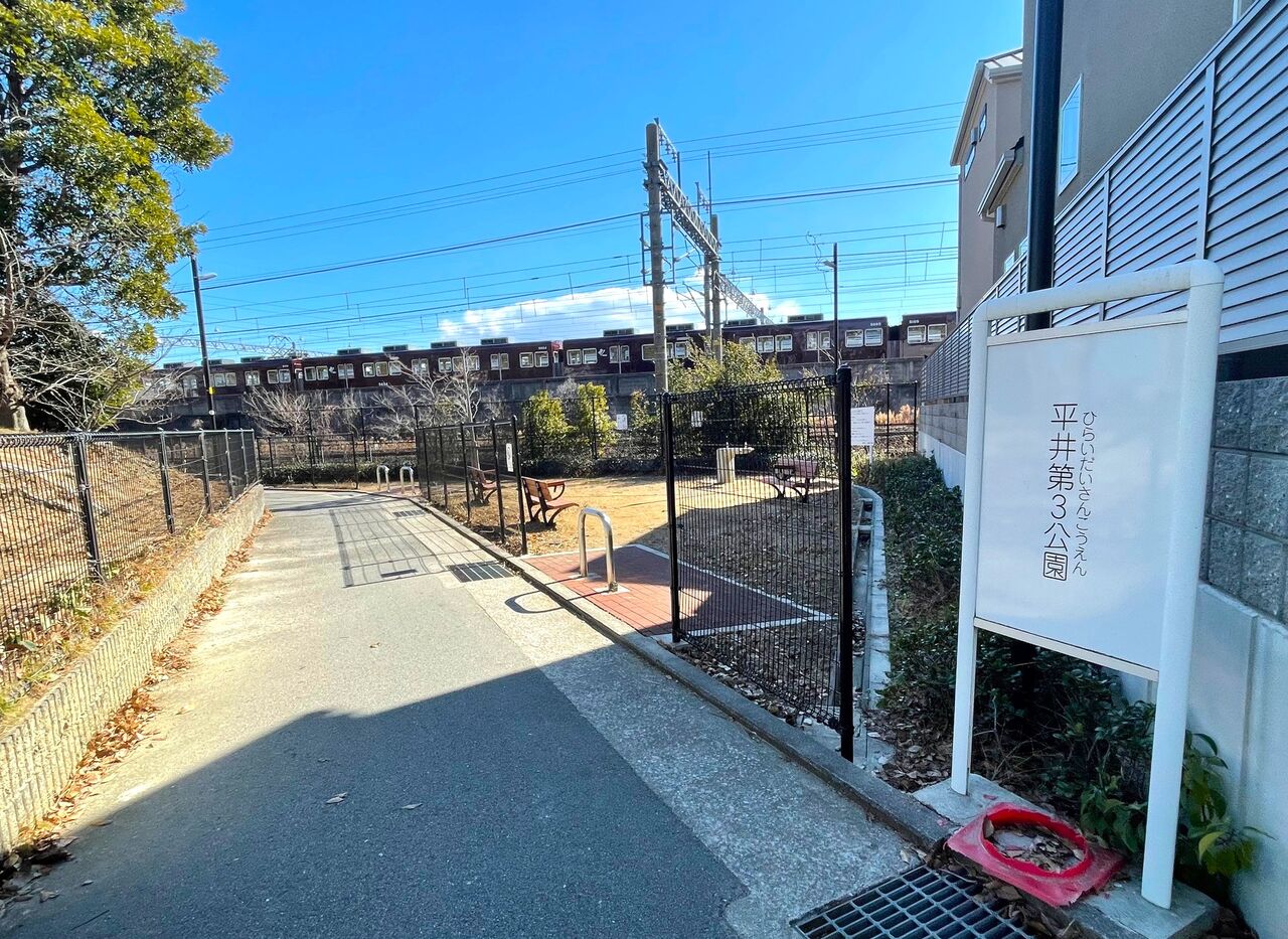 すると、こちらには『平井第3公園』なるものが!こちらはベンチがあるものの遊具などはない三角形の小さな公園でしたが、より近くで電車を見ることができそうです!