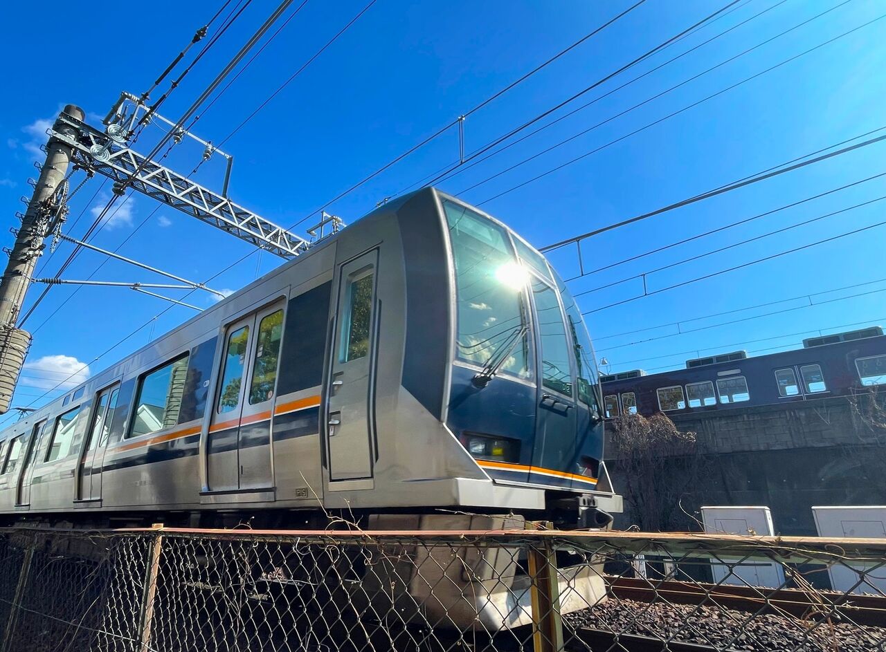 少し場所を移動して、なんとか両車両を前から撮影してみましたが、阪急電車は下半分が見えません(しょんぼり)。