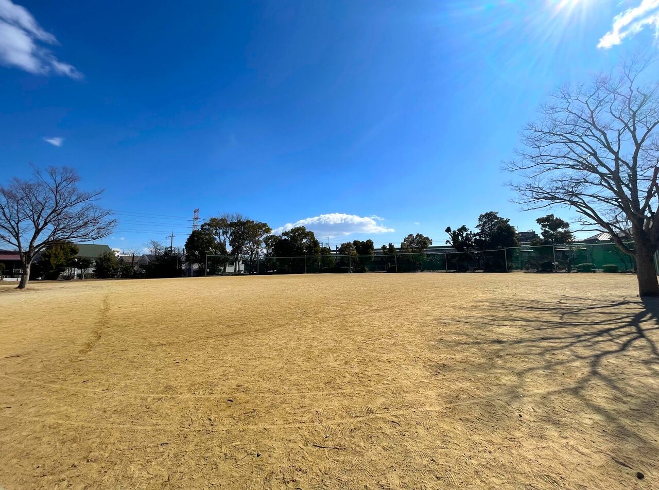 この遊具エリアに隣接しているのが大きなグラウンド。端の方にはネット裏にベンチも並んでいます。