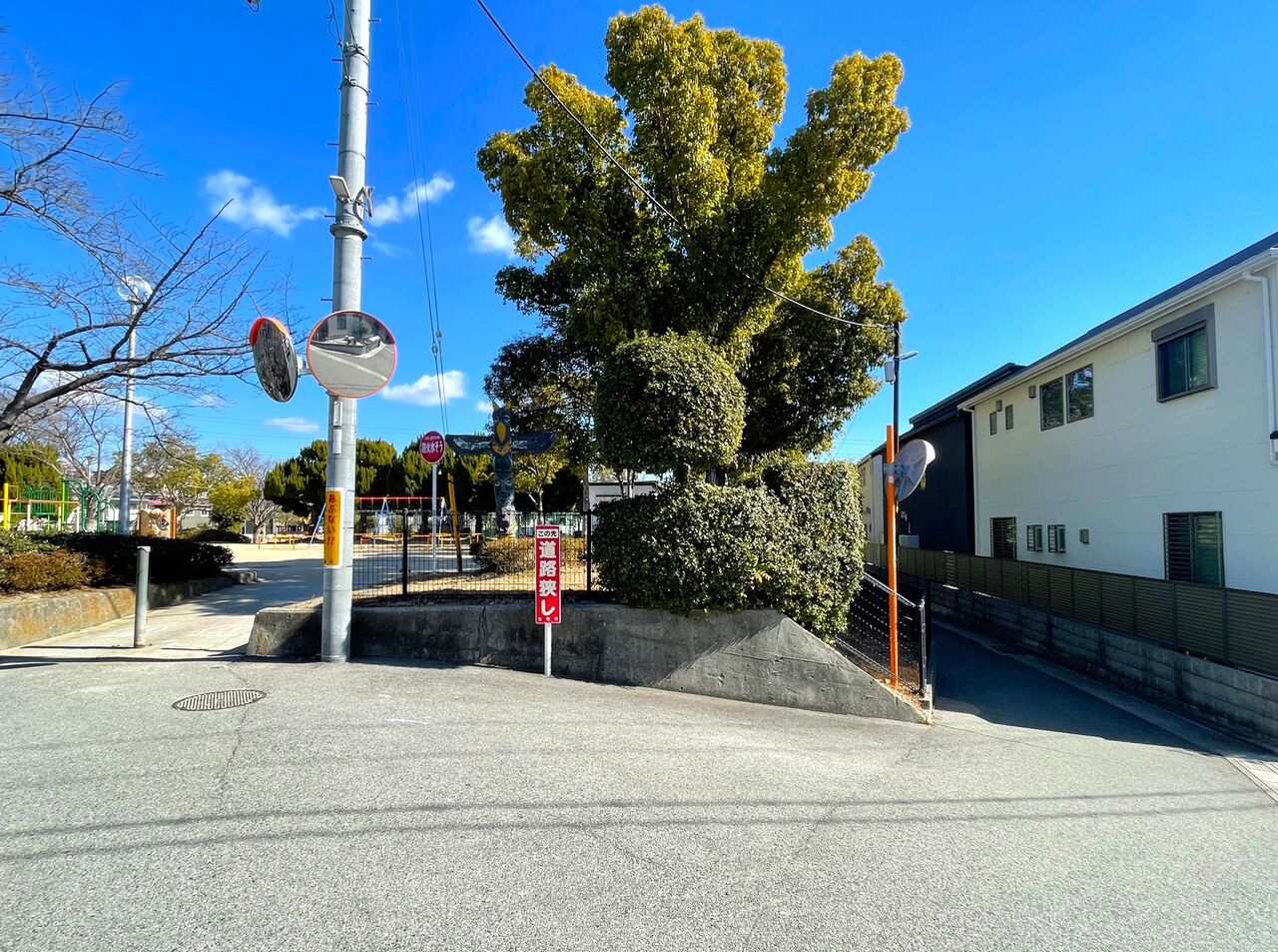 両電車のランデブーをもっと近くで見てみたい!と、トーテムポールのある公園南西の入口を出て、この写真右側にある道へ進んでみました。