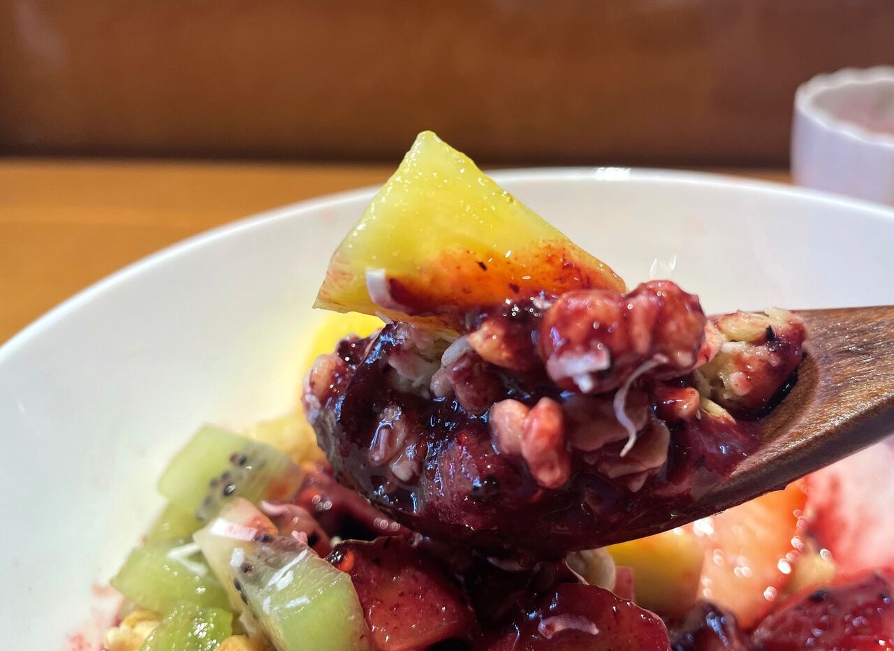 フルーツを合わせて口に運ぶと、新鮮なフルーツの瑞々しさとアサイーのペーストがいい具合に絡まり合ってこれまた美味しい!