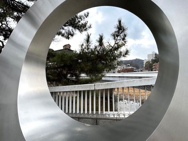 先ほどの写真は、タイトル『枠どられた風景』、ハンガリー・ブタペスト生まれのマルタ・パン(1923~2008)女性彫刻家の作品です。オランダのクレーラー=ミューラー美術館の庭園など世界中の美術館や公園に置かれ、日本では東京都庁舎の人工池にある『風景の断片』(1991)、箱根・彫刻の森美術館の池にある『浮かぶ彫刻』(1969)、札幌・芸術森美術館にある『浮かぶ彫刻・札幌』(1986)など数多く見ることができるようです。その一つが宝塚市の宝来橋にもあるのですね。