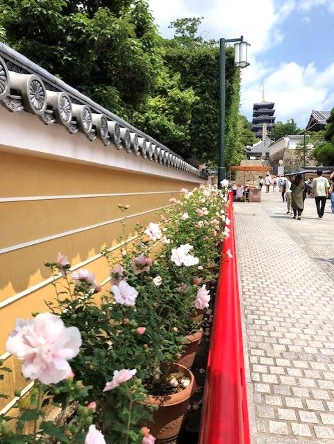 こちらは、夏の頃の中山寺山門から見た境内の様子です。季節の花々と朱塗りがとても美しいです