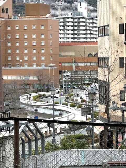 こちらは、宝来橋南詰交差点にある「湯本台広場」の上側から撮影しています。離れて見ると「S字」になっているのがわかりやすいですね