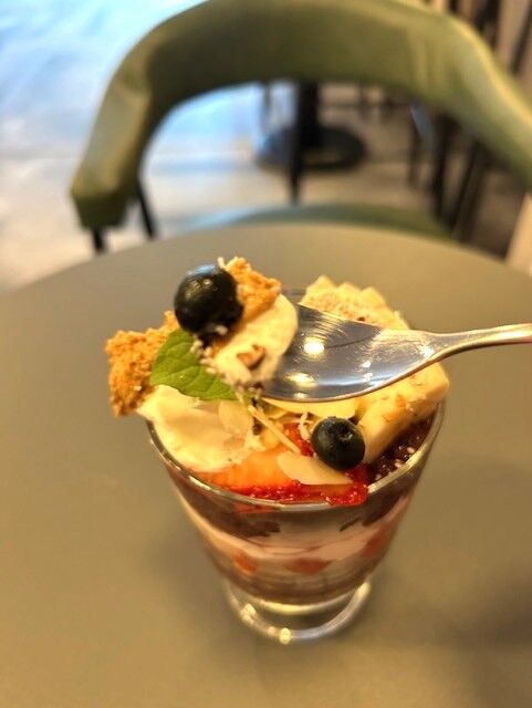 調べてみると、アサイーボウルってブラジル発祥なんですね。下の方にはアサイーのスムージーやグラノーラがたっぷり入っています。アサイーはブラジルのアマゾン原産のヤシ科の植物で、ポリフェノールや鉄分、カルシウム、マグネシウムなどのミネラル類、ビタミンE、ビタミンB1、食物繊維、抗酸化物質であるアントシアニンが豊富に含まれているそうです。美容や健康にも適しているんですね。疲れている時にもぴったりなのではないでしょうか。