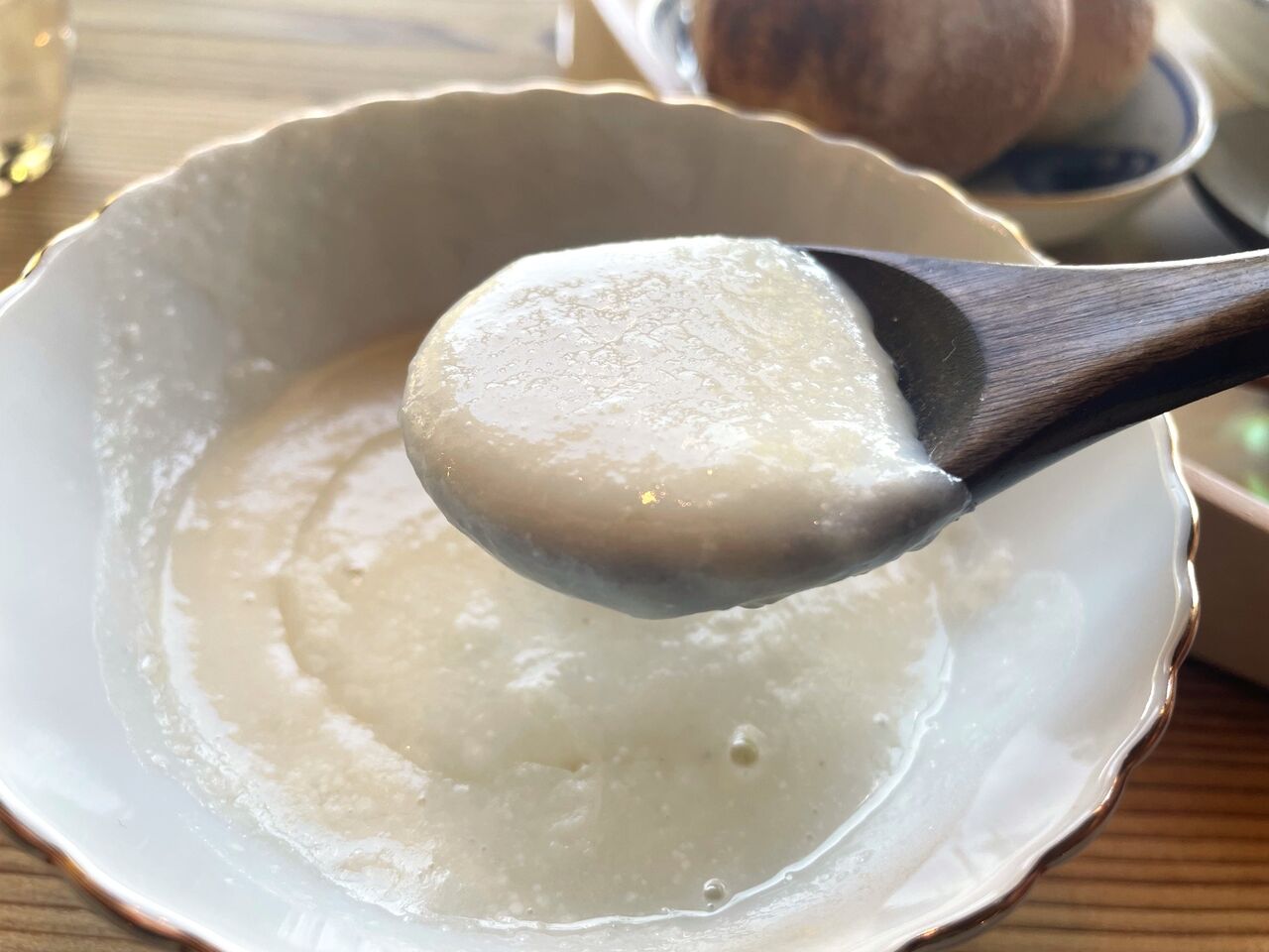 色味からしてさらりとした食感かと思ったポタージュスープは、こっくりとしたまろやかさがあり、かぶやじゃがいもの素材の味も感じられる美味しいスープ!