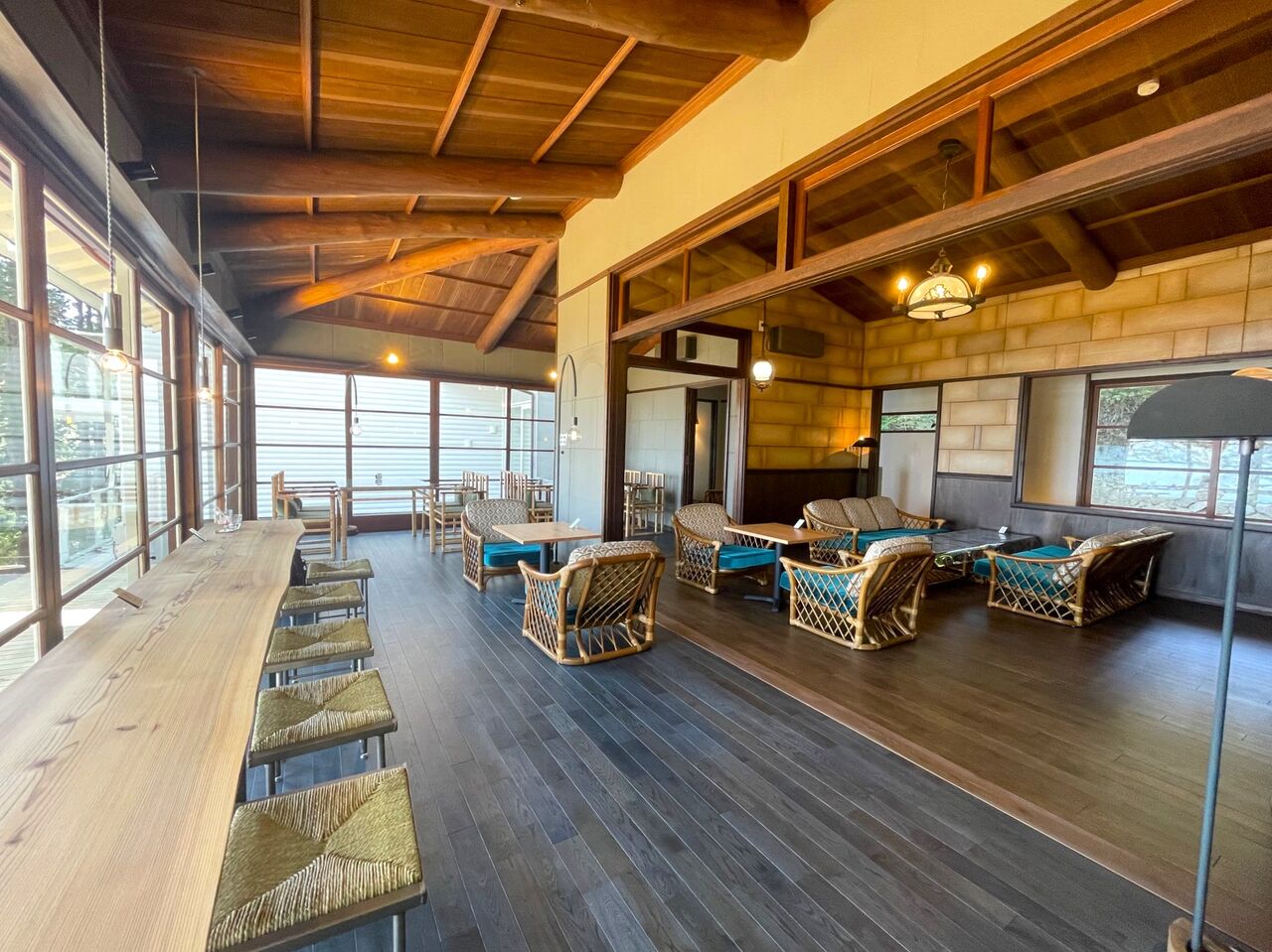 店内にはソファ席、テーブル席、カウンター席があります。そして建具や家具、照明の一部は当時のものをリペアして使用されているようです。