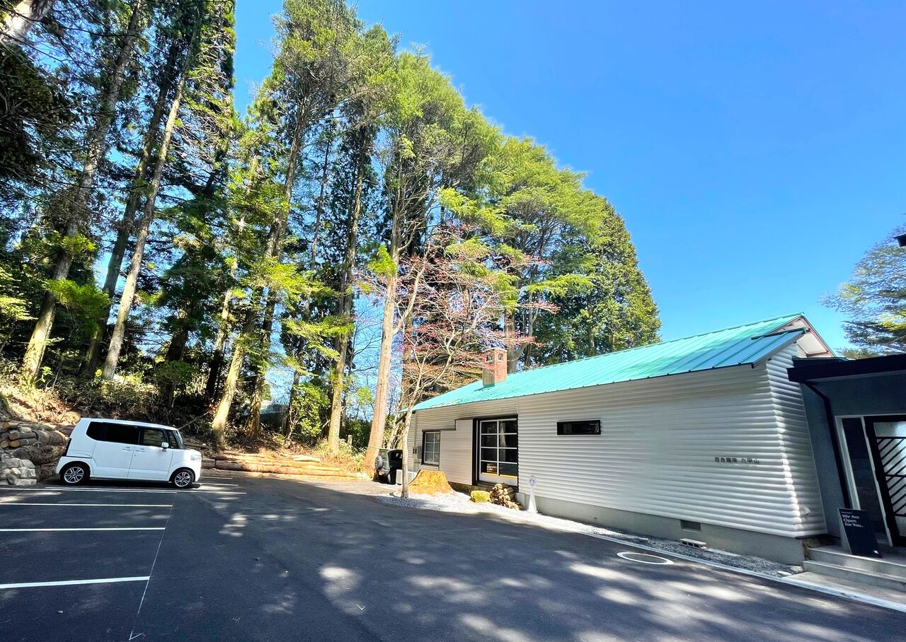 緑色の屋根にえんとつが乗った、自然の中に溶け込む可愛らしい建物です。駐車場もたくさんありますね。