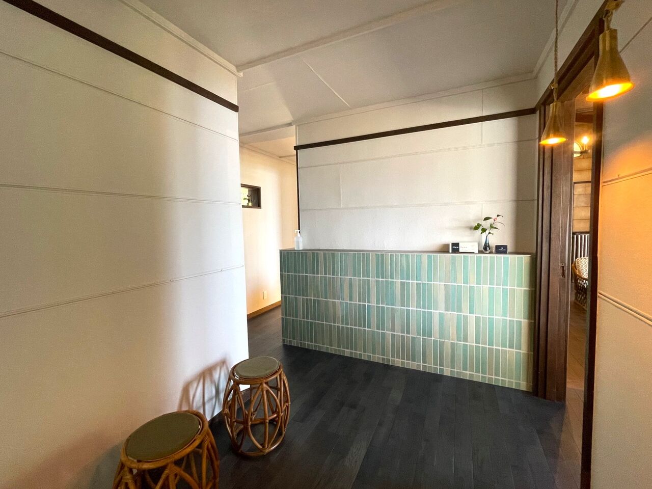 白い壁に濃淡グリーンのタイルをあしらったおしゃれな前室に、カフェスペースへの期待も高まります。